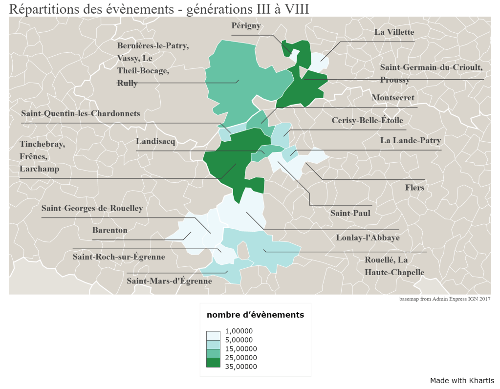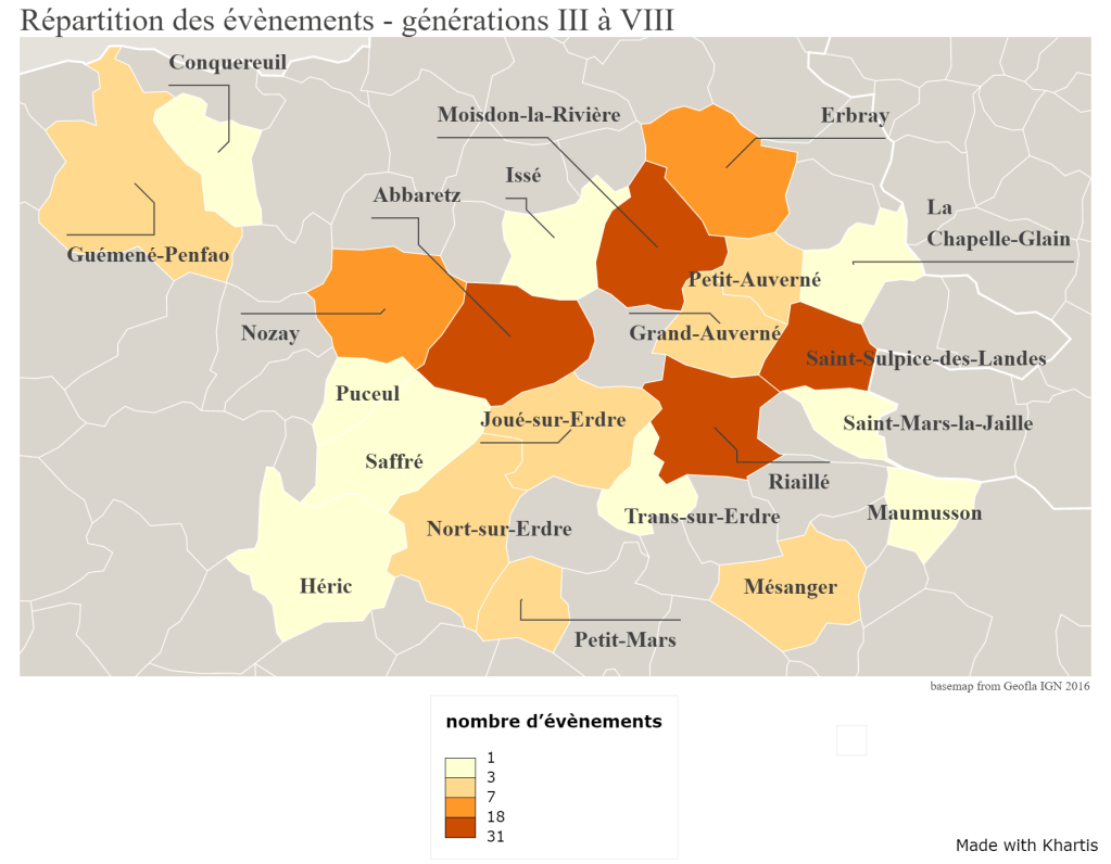 Nota Bene : les cartes que j’ai réalisées indiquent le nombre d’évènements par commune, un évènement étant une naissance, un mariage ou un décès.