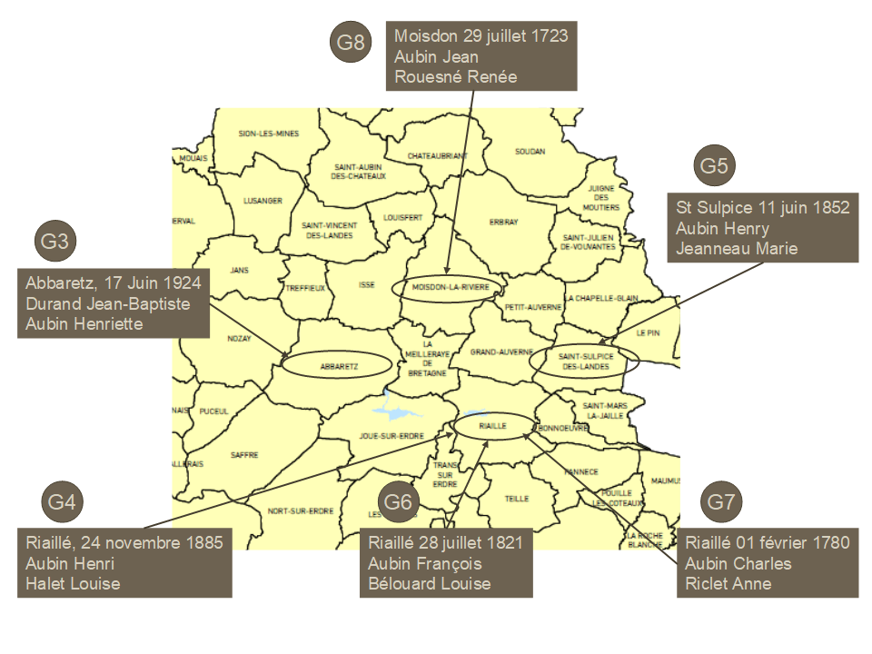 Le plus ancien AUBIN que nous connaissons se prénomme François. Les registres paroissiaux nous disent qu’il est décédé à l’âge de 40 ans le 27 février 1710 au village de la Boulais dans la paroisse de Moisdon où il résidait, et qu’il était marié à Perrine RIAILLÉ. Il était maréchal à la naissance de sa fille Marie en 1699, et laboureur lors du baptême de son autre fille Jacquette en 1704 . Il a vécu à Moisdon, et ses descendants ont vécu à Riaillé.