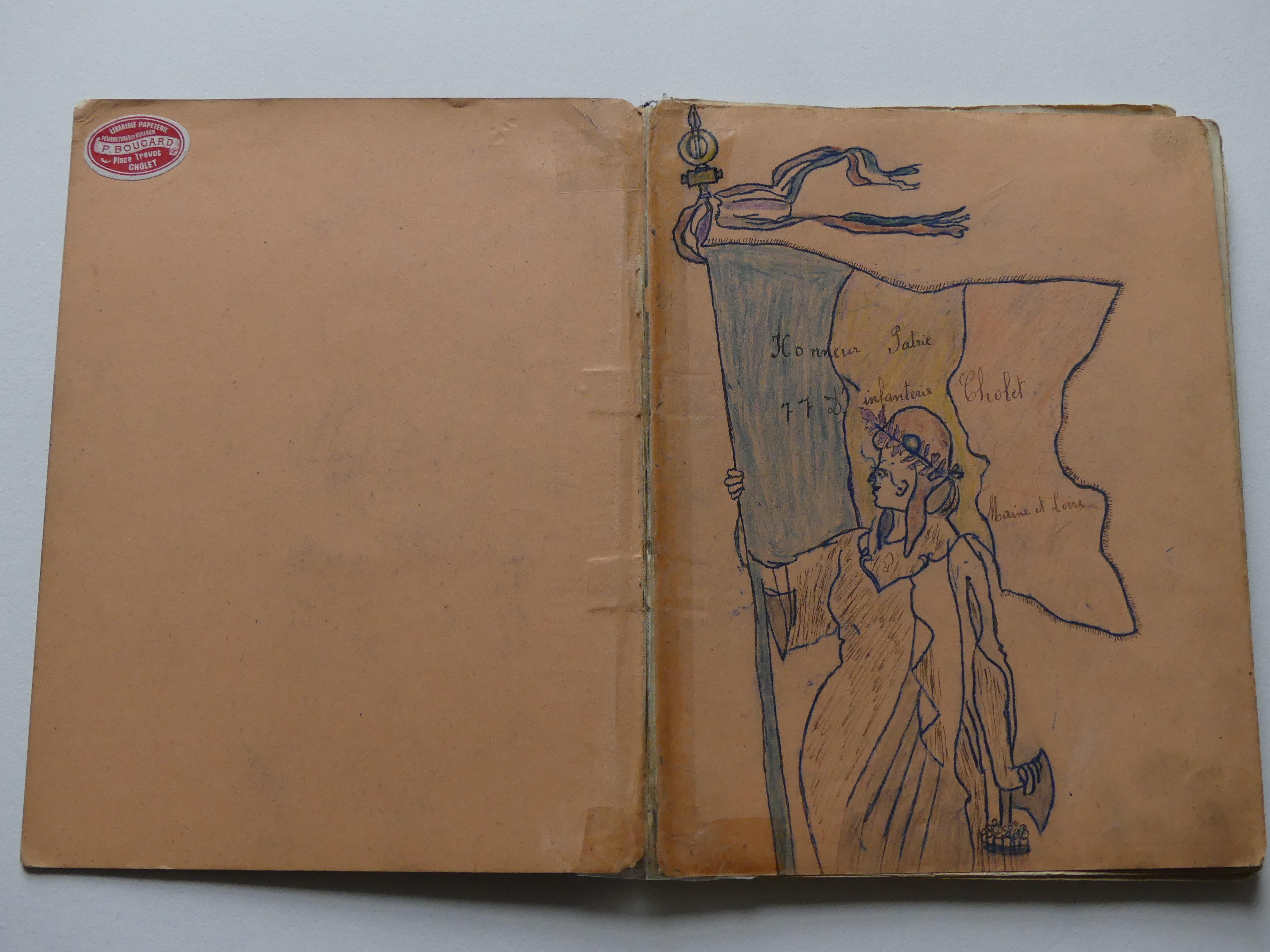 Aujourd’hui, parcourons le cahier qu’il a réalisé pendant son service militaire, effectué d’octobre 1911 à novembre 1913. C’est le plus décoré. Voici quelques photos. Tu peux les agrandir en cliquant dessus.