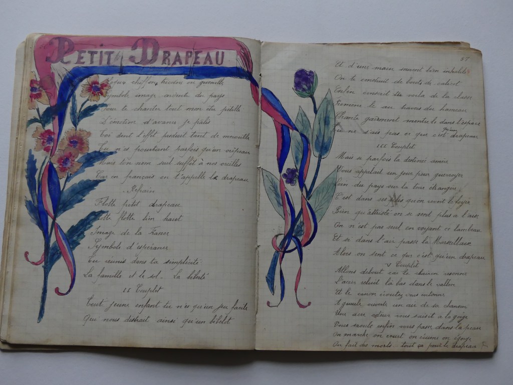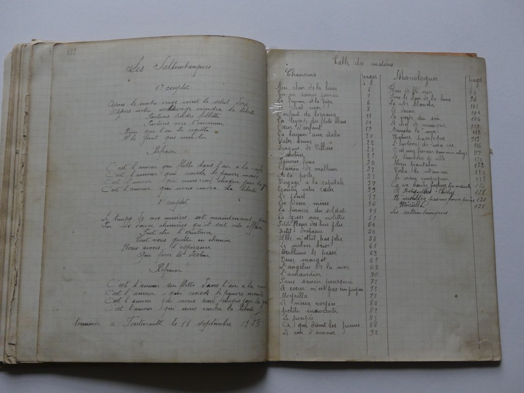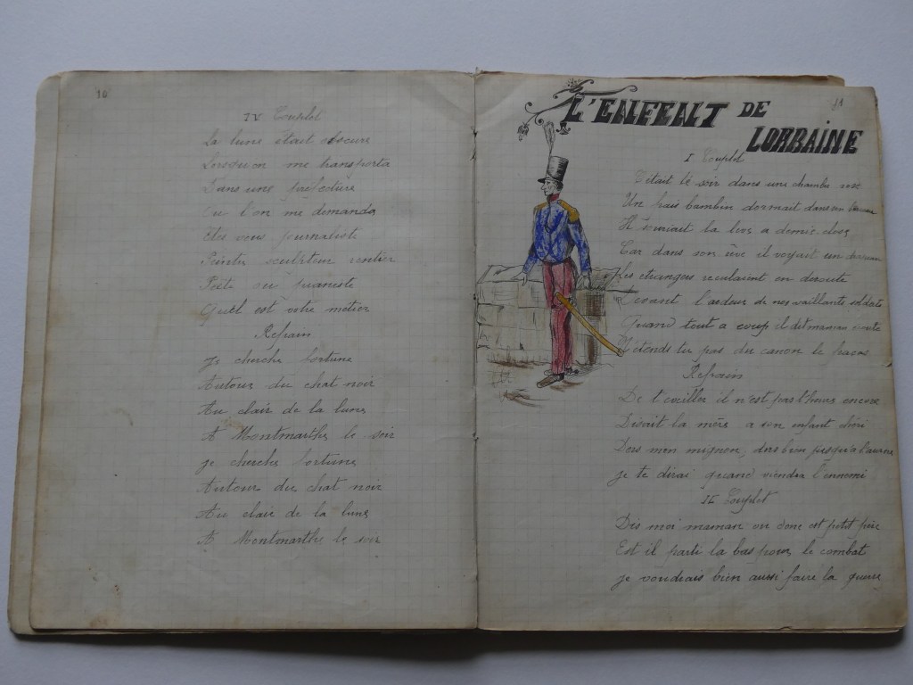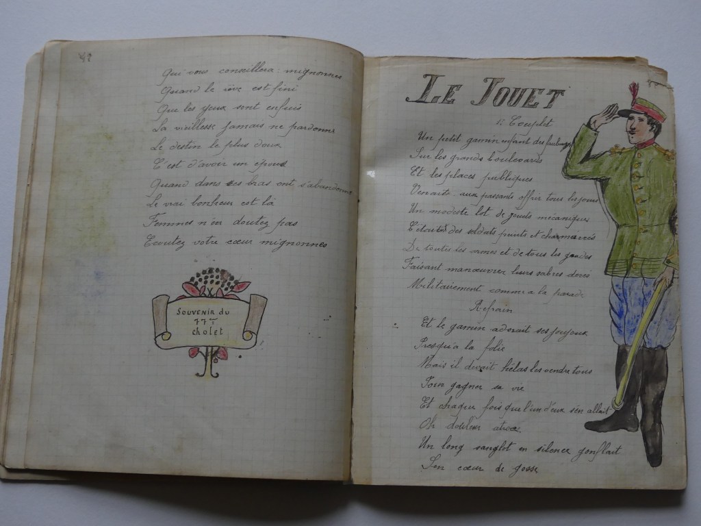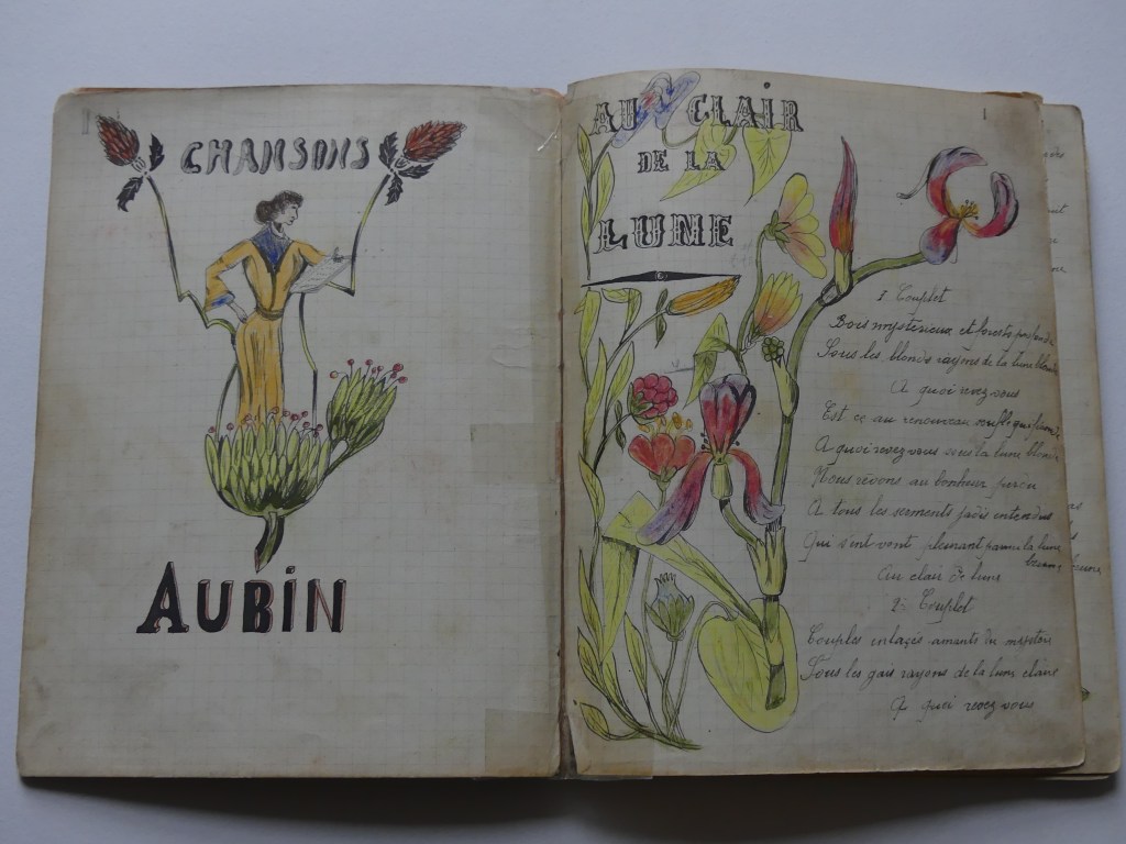 Quatre cahiers lui appartenant sont arrivés jusqu’à nous, conservés précieusement par notre tante Marie. Ces cahiers contiennent des chansons, quelques monologues et des dessins. Tu pourras voir que notre grand-oncle écrivait et dessinait très bien.