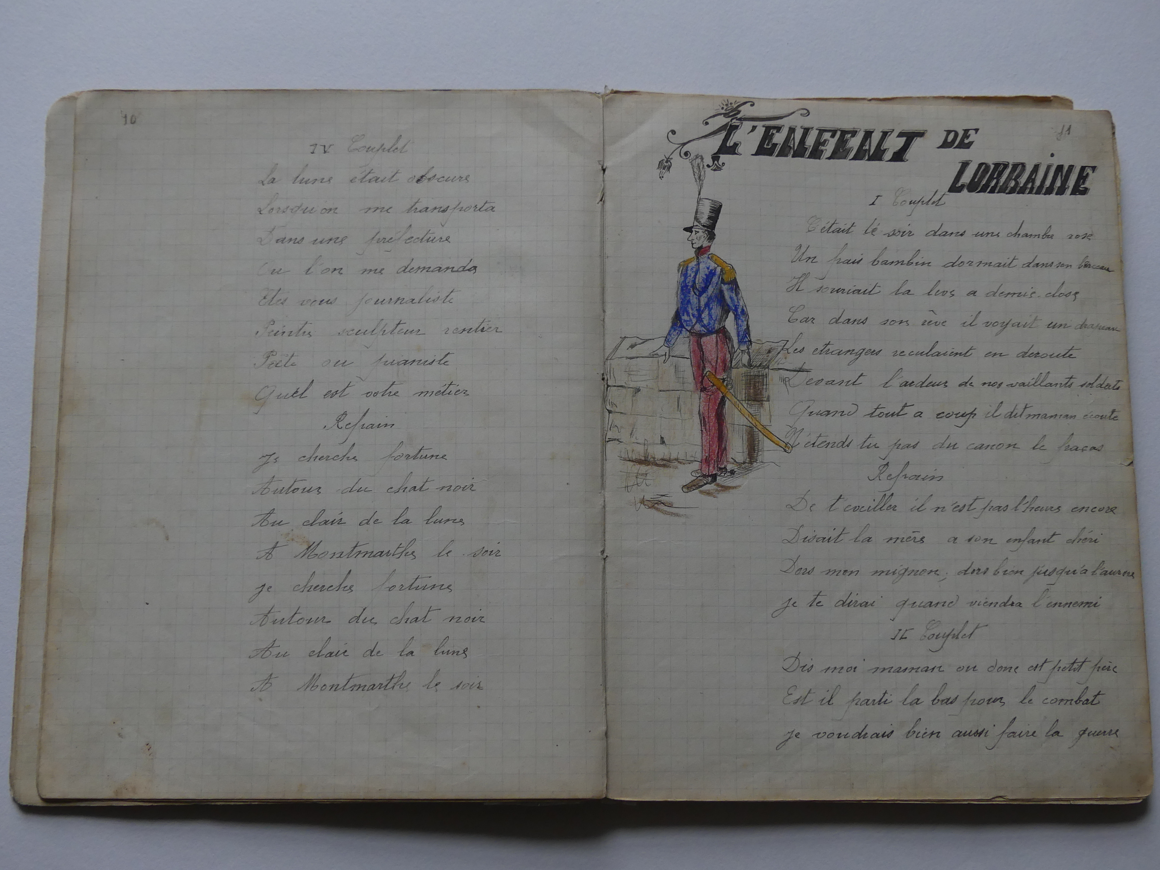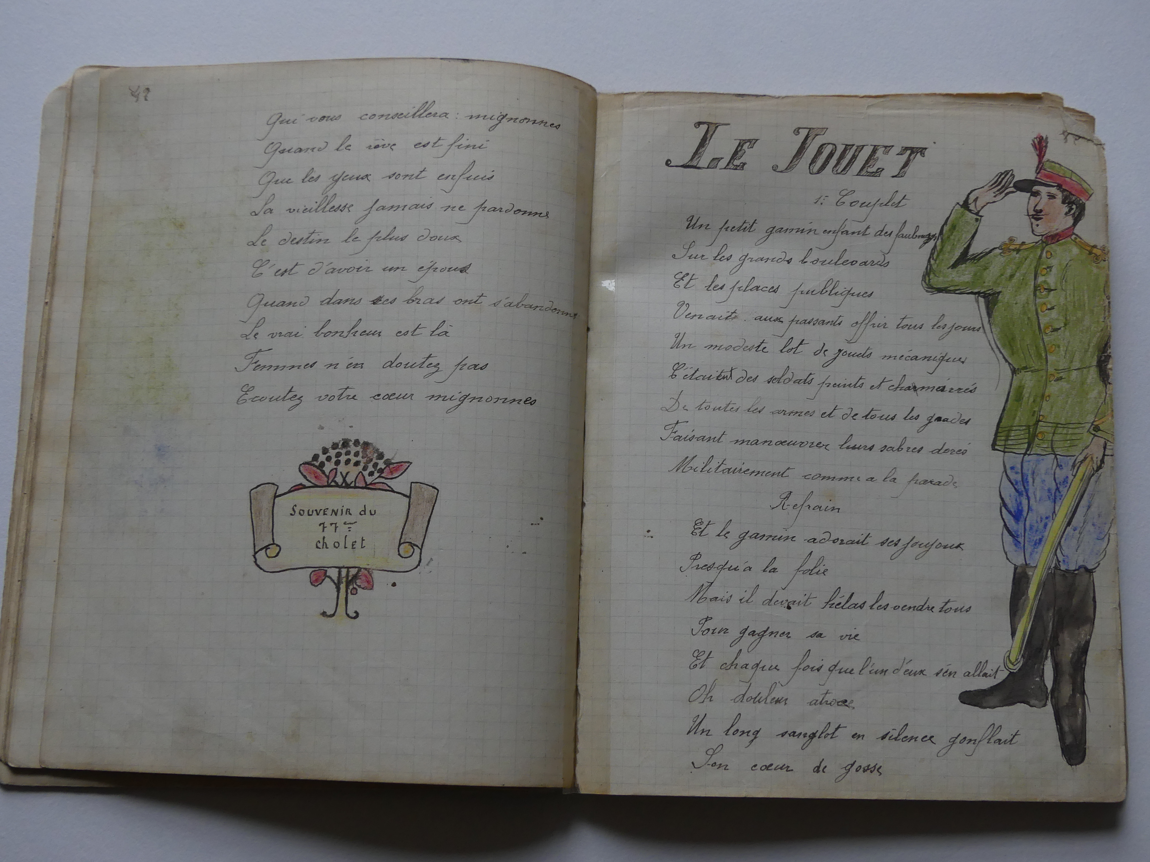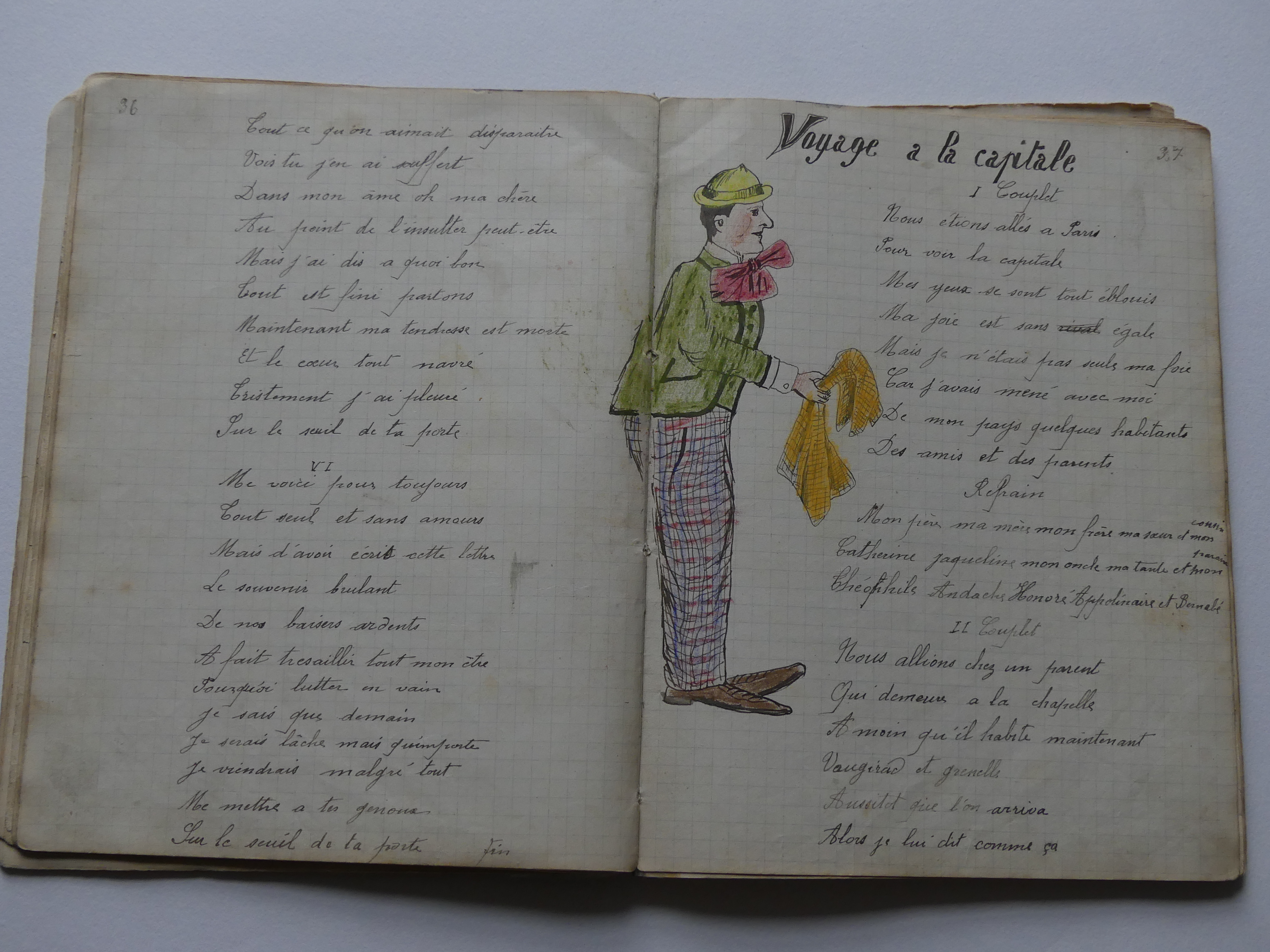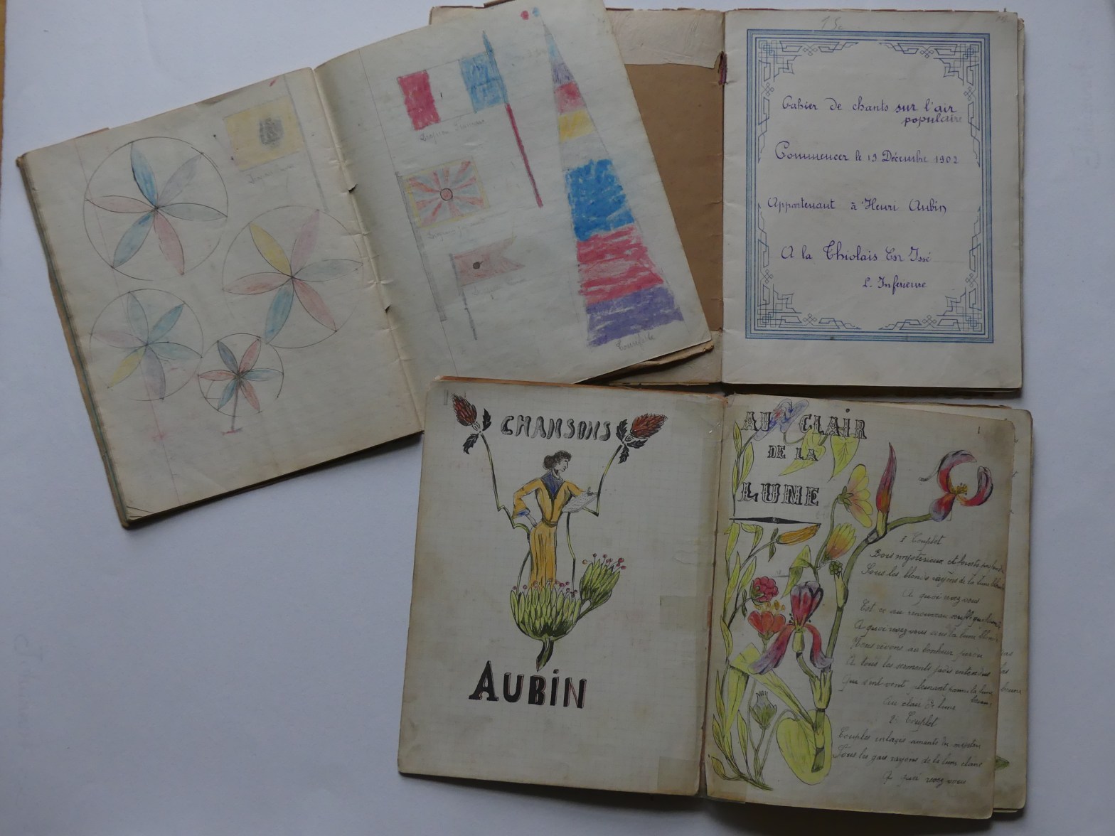 Quatre cahiers lui appartenant sont arrivés jusqu’à nous, conservés précieusement par notre tante Marie. Ces cahiers contiennent des chansons, quelques monologues et des dessins. Tu pourras voir que notre grand-oncle écrivait et dessinait très bien.