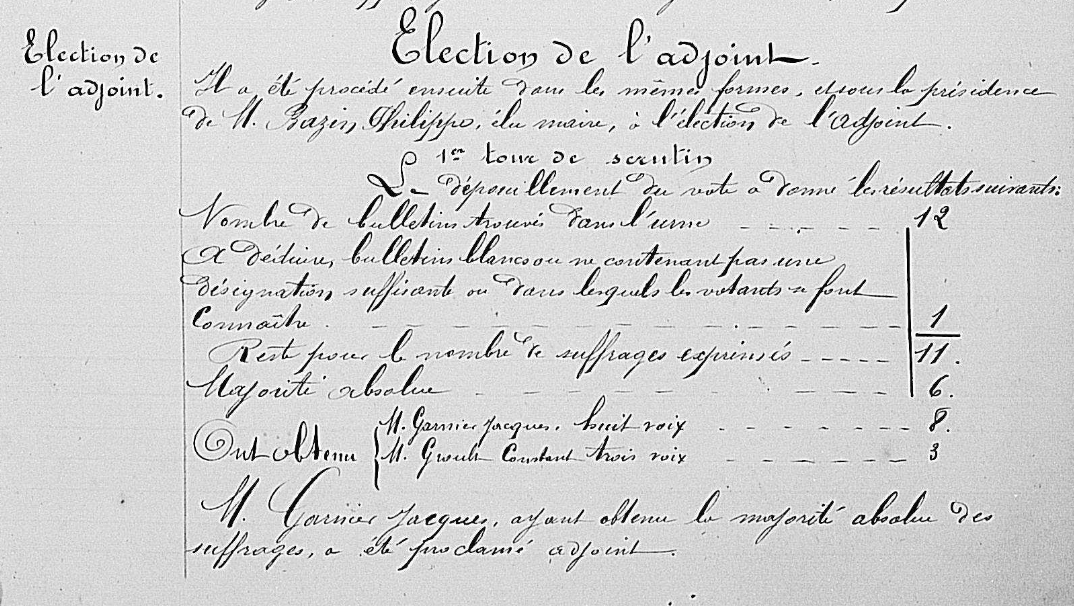 Jacques est élu conseiller municipal de Saint-Germain-du-Crioult en 1865. Il y rejoint un cousin homonyme, fils de son oncle François GARNIER, habitant les Iles. Le 14 mai 1871, il est élu adjoint au maire. Il le sera à nouveau en 1874, 1888 et 1896 (N’ayant pas lu de façon exhaustive le cahier des délibérations municipales, je ne suis pas certain qu’il ait été adjoint en continu depuis 1871, d’autant qu’à son décès en 1904, le Journal de Condé mentionne qu’il était adjoint depuis 15 ans).