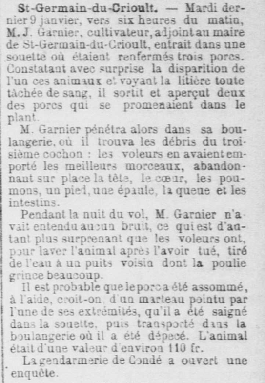 On sait, grâce au journal de Condé que Jacques Garnier a été victime d’au moins deux cambriolages. Le 9 janvier 1894, 3 cochons ont été tués sur place et dépecés (édition du dimanche 14 janvier 1894) :