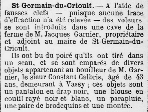 Plus tard, en avril 1895, les voleurs ont bu du poiré, et volé quelques objets (édition du dimanche 28 avril 1895). Il n’est pas dit s’il agit de la même équipe :
