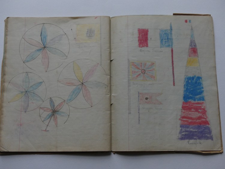 Sur les pages précédentes, il a dessiné quelques drapeaux : le drapeau de la Russie sur la page de gauche, et sur la page de droite, sous le drapeau français, le drapeau japonais et le drapeau chinois :