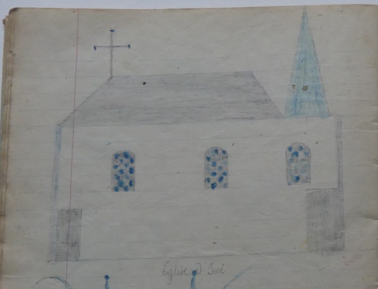 Sur la même page, il a aussi dessiné l’église d’Issé (dont tu peux voir des photos sur le site Clochers de France ) :