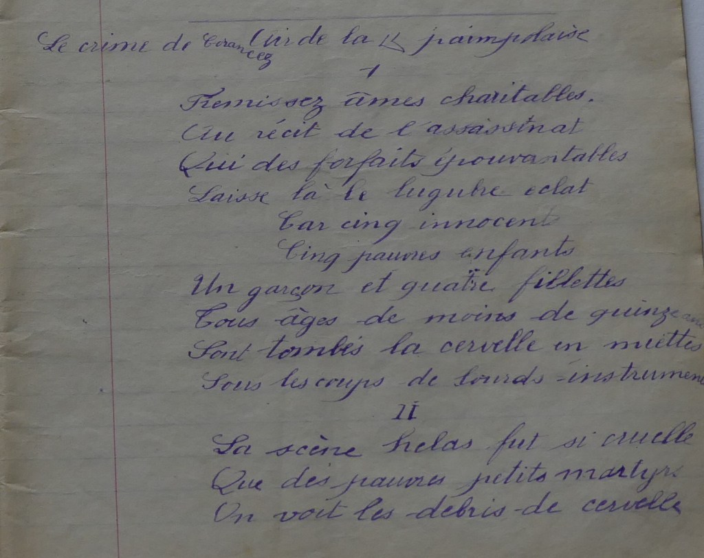 Curieux texte… Ce cahier en contient six autres du même type. En tournant les pages, ou plus exactement en parcourant les photos des pages du cahier, je relève le titre de l’un d’entre eux, toujours sur l’air de la paimpolaise : Le crime de Corancez. En cherchant sur internet, je découvre que Corancez est un village proche de Chartres où a eu lieu, le 25 avril 1901, l’assassinat de 5 enfants dans leur lit. Et c’est effectivement ce que raconte le texte reproduit par notre grand-oncle !