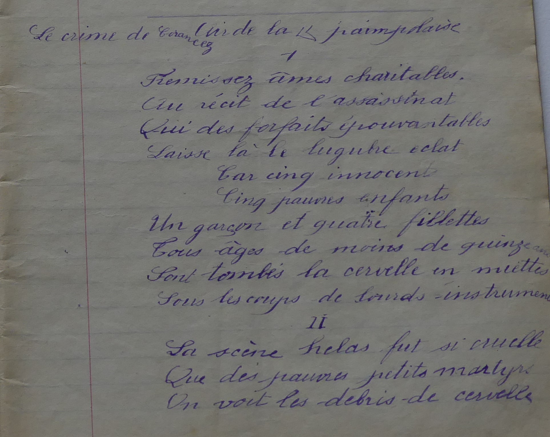 Curieux texte… Ce cahier en contient six autres du même type. En tournant les pages, ou plus exactement en parcourant les photos des pages du cahier, je relève le titre de l’un d’entre eux, toujours sur l’air de la paimpolaise : Le crime de Corancez. En cherchant sur internet, je découvre que Corancez est un village proche de Chartres où a eu lieu, le 25 avril 1901, l’assassinat de 5 enfants dans leur lit. Et c’est effectivement ce que raconte le texte reproduit par notre grand-oncle !