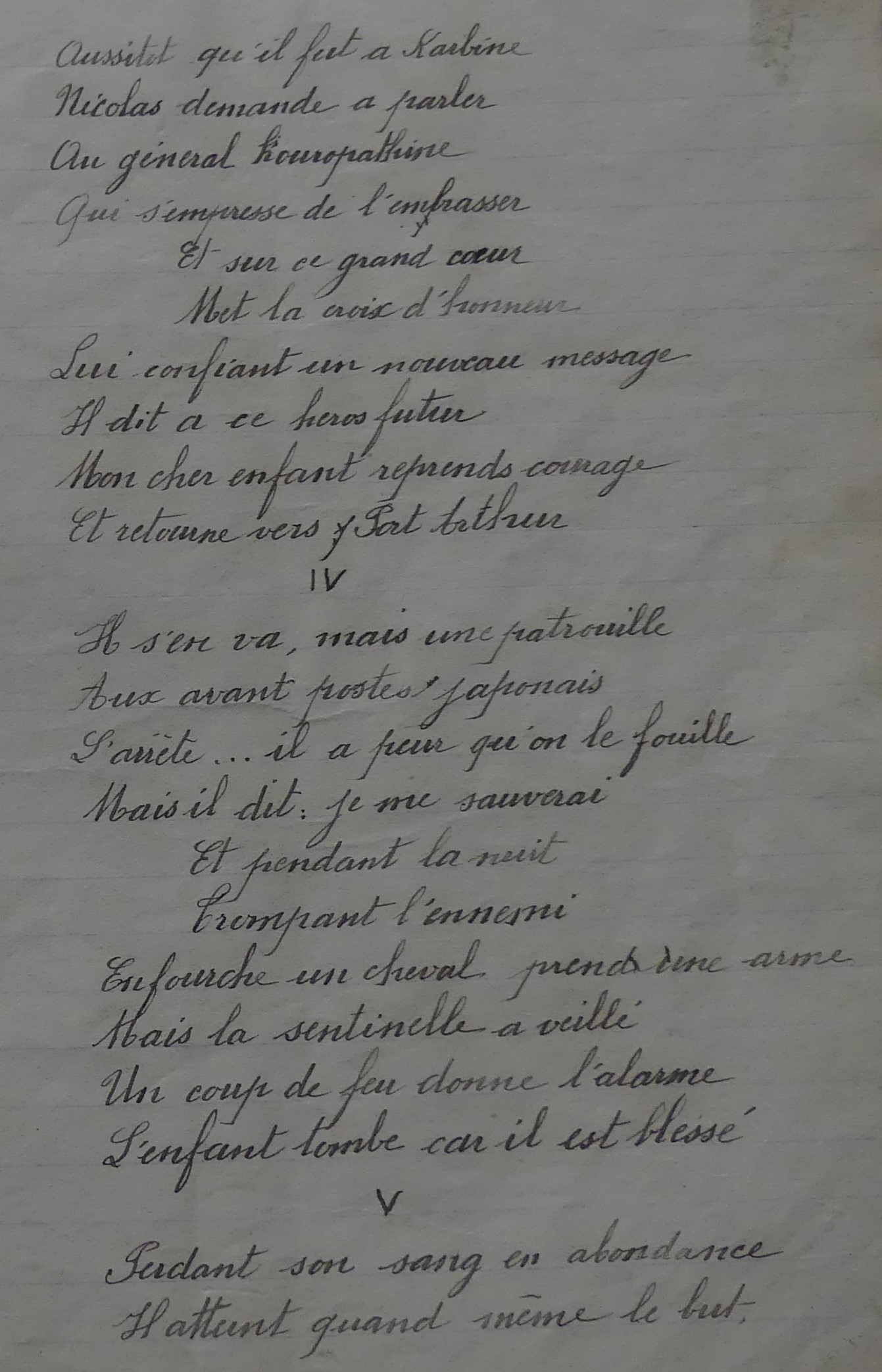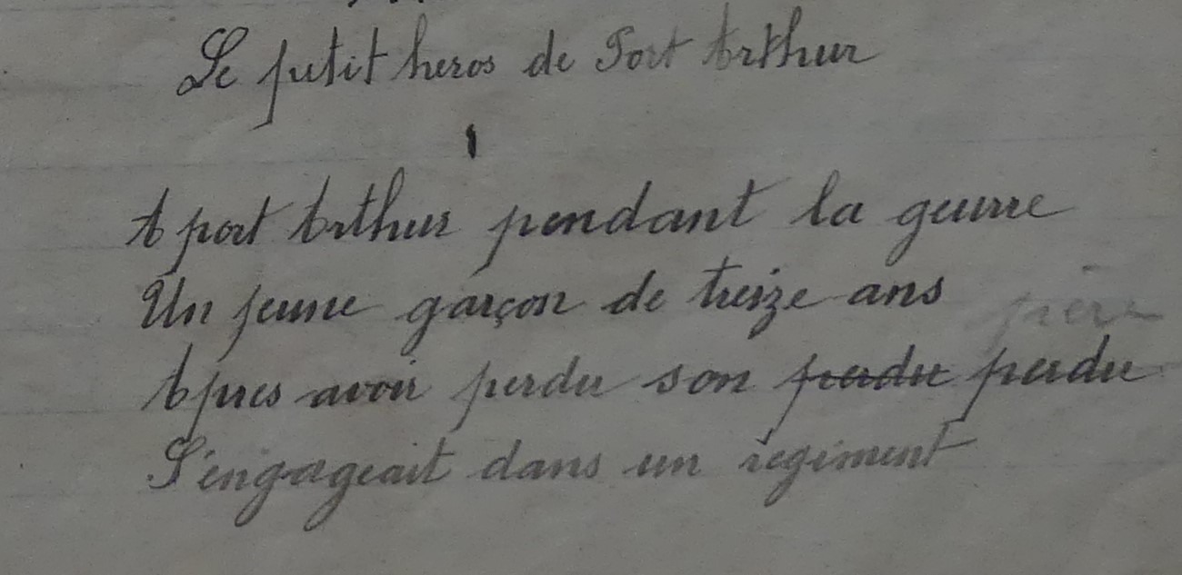 - le petit héros du siège de Port Arthur : Port Arthur est situé en Chine et se nomme Lüshunkou. Il était à l’époque sous domination russe. Son siège a eu lieu pendant la guerre russo-japonaise de 1904-1905, à l’issue duquel les russes ont capitulé au profit des japonais. Je n’ai pas trouvé trace de l’histoire dont il est question dans cette complainte :