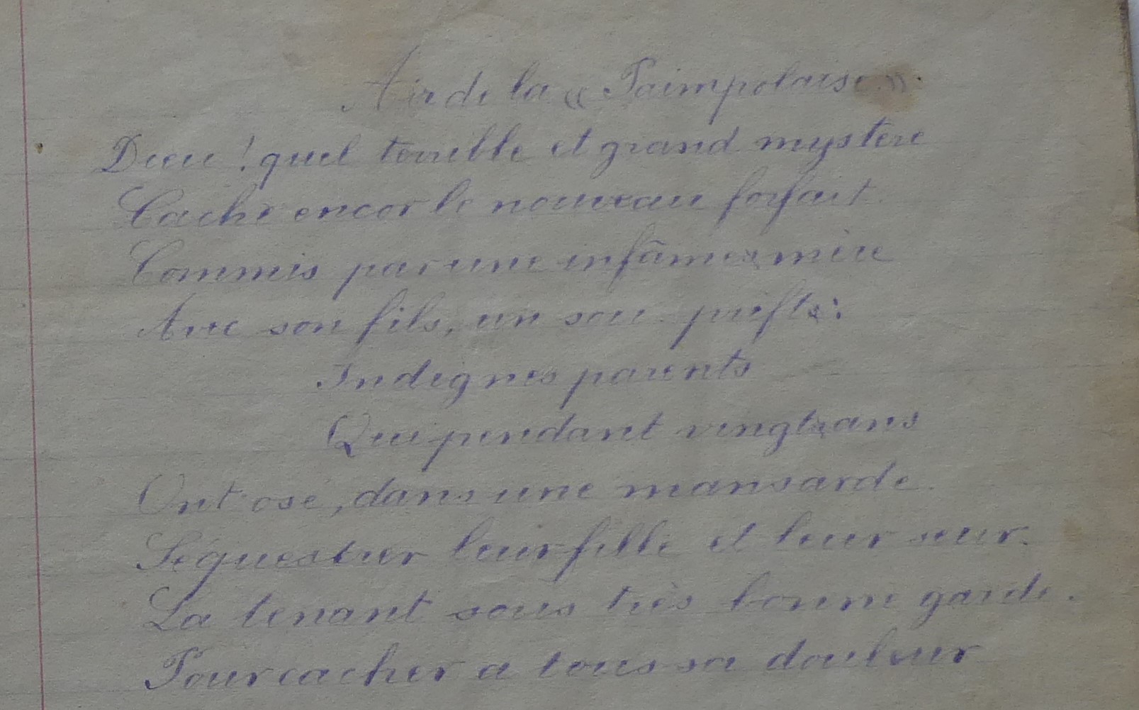 Sur l’air de la Paimpolaise : Dieu ! quel trouble et grand mystère / cache encore le nouveau forfait / commis une infâme mère / avec son fils un sous-préfet / Indignes parents / qui pendant vingt ans / ont osé dans une mansarde / séquestré leur fille et leur sœur / la tenant sous très bonne garde.
