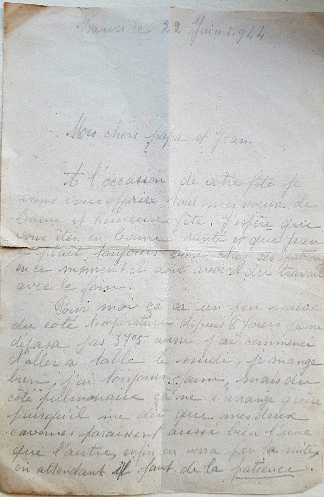 Nous sommes le 22 juin 1944, donc encore en guerre, un peu plus de deux semaines après le débarquement en Normandie. La suite du courrier est consacré à cela.