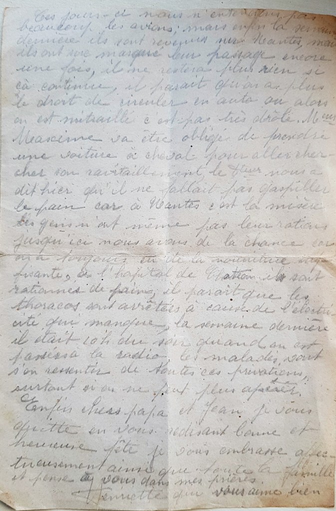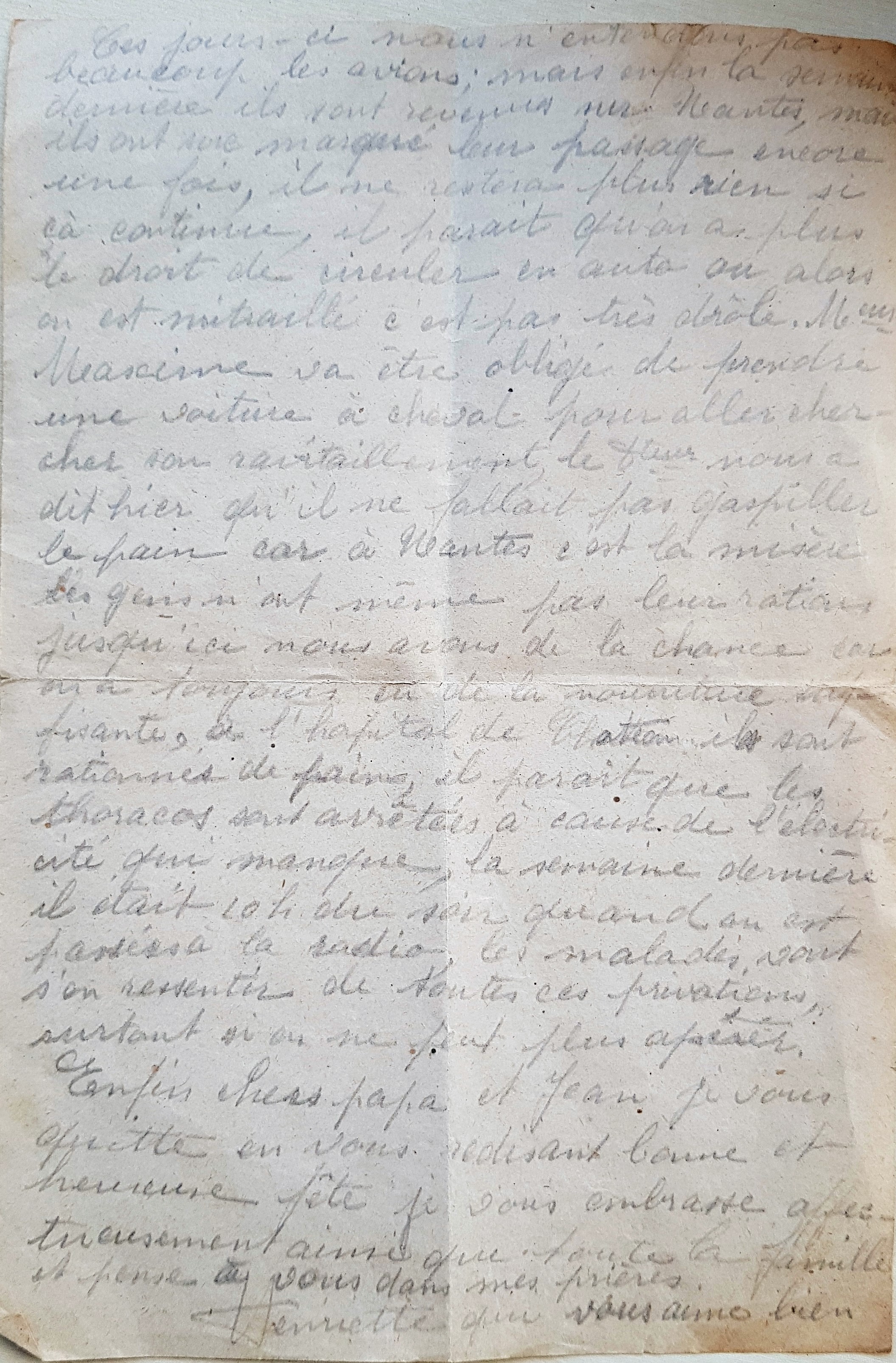 Ces jours-ci nous n’entendons pas beaucoup les avions; mais enfin la semaine dernière, ils sont revenus sur Nantes, mais ils ont marqué leur passage encore une fois, il ne restera plus rien si cela continue, il parait qu’on a plus le droit de circuler en auto ou alors on est mitraillé c’est très drôle. Monsieur Maxime va être obligé de prendre une voiture à cheval pour aller chercher son ravitaillement. Le docteur nous a dit hier qu’il ne fallait pas gaspiller le pain car à Nantes c’est la misère les gens n’ont même pas leurs rations. Jusqu’ici, nous avons de la chance car nous avons toujours eu de la nourriture satisfaisante. A l’hôpital de Chateau ils sont rationnés de pain, il parait que les thoracos sont arrêtées à cause de l’électricité qui manque. La semaine dernière, il était 10h du soir quand on est passées à la radio, les malades vont s’en ressentir de toutes ces privations, surtout si on ne peut plus opérer.