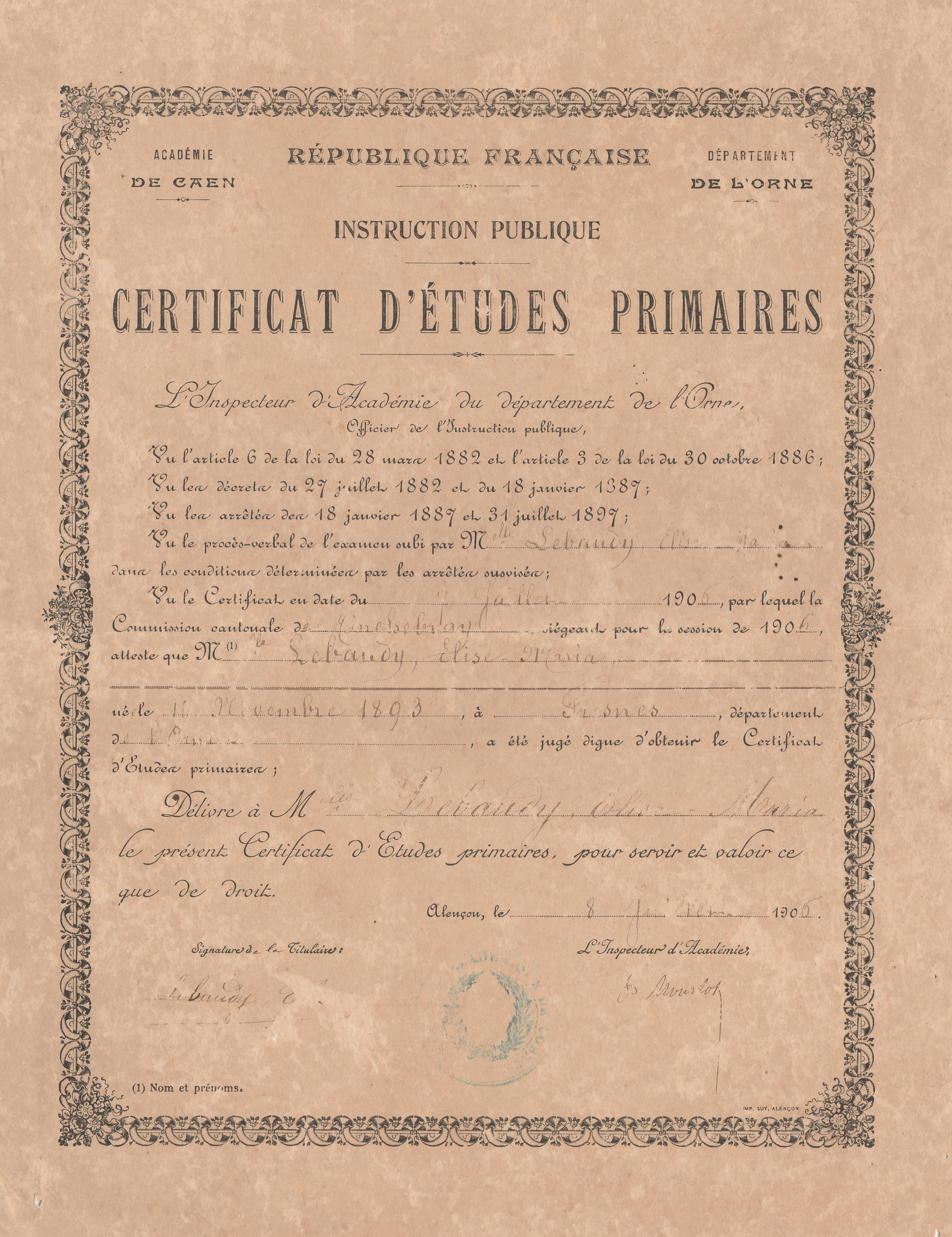 Est aussi parvenu jusqu’à nous, le diplôme du certificat d’études primaires qu’Elise a obtenu en juillet 1906, à l’âge de 12 ans. Nous pouvons voir sa signature en bas à gauche du diplôme, malheureusement en partie effacée :
