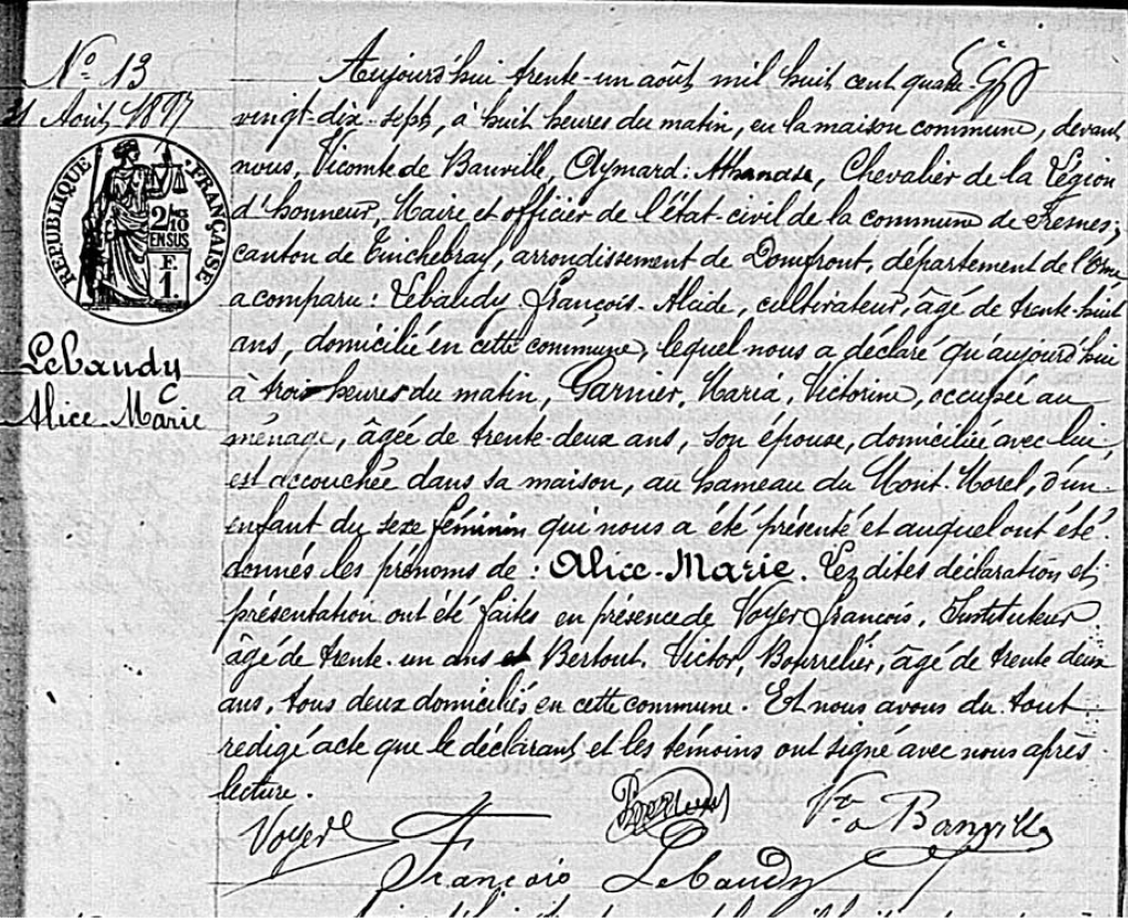 Quatre ans plus tard, ou presque, le foyer voit la naissance d’une deuxième fille : Alice, le 31 août 1897, à 3 heures du matin comme sa grande sœur. Son père François la déclare à 8 heures, toujours auprès du même maire de Frênes. Alice porte les prénoms de « Alice Marie ».
