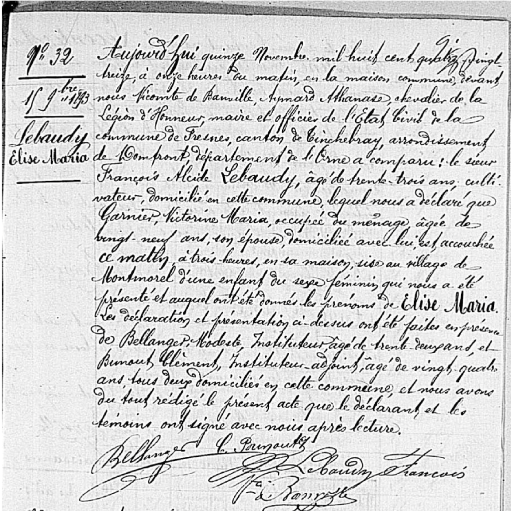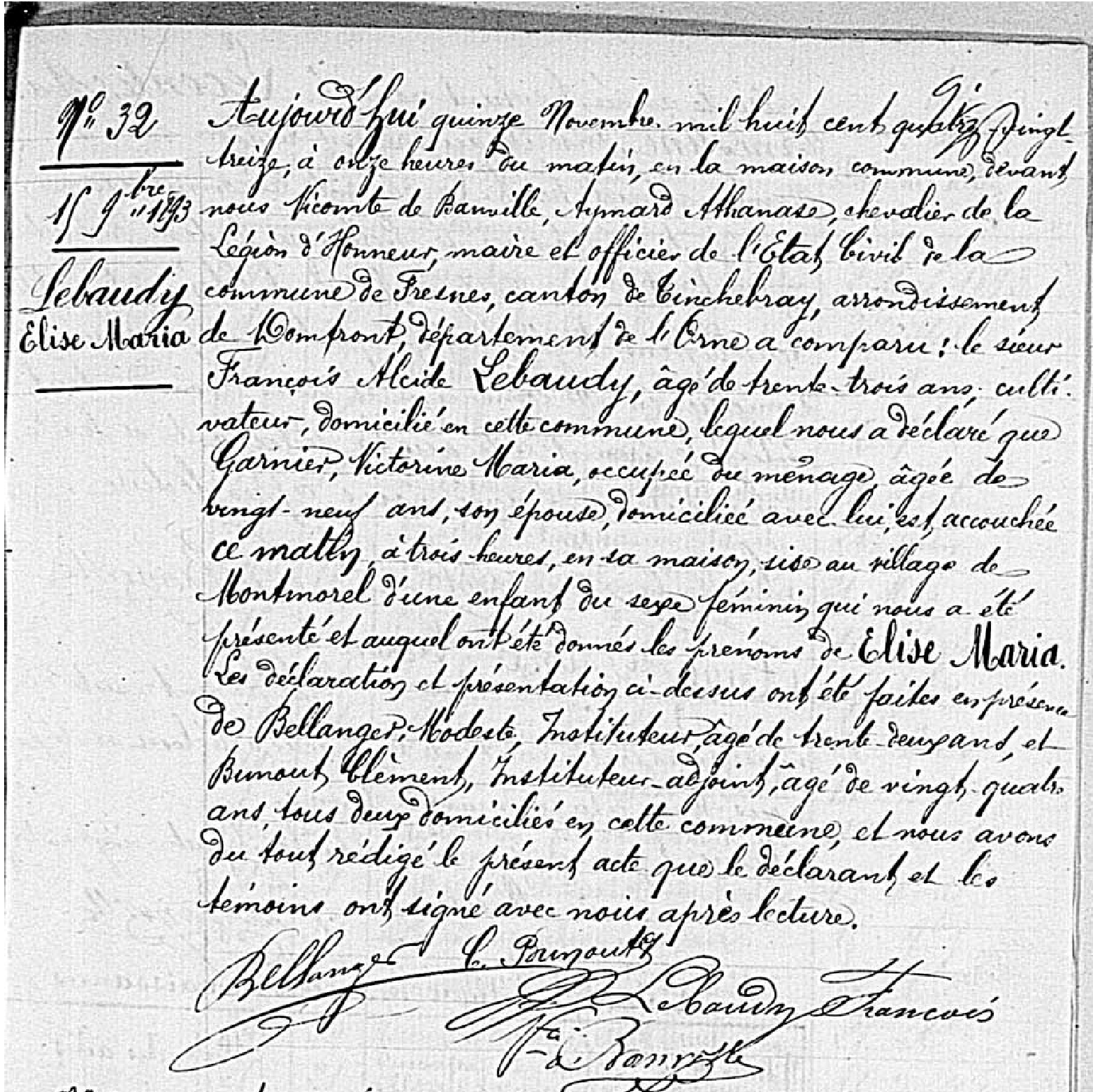 Elise est née au Mont Morel, le 15 novembre 1893 à 3 heures du matin. Son père, François, déclare sa naissance le jour même à 11 heures. C’est Aymard Athanase Vicomte de Banville, maire de Frênes et propriétaire de la ferme que la famille exploite, qui signe son acte de naissance. François LEBAUDY, 33 ans, et Maria GARNIER, 29 ans, se sont mariés un an auparavant, le 16 novembre 1892. Les prénoms d’Elise à l’état civil sont « Elise Maria ».