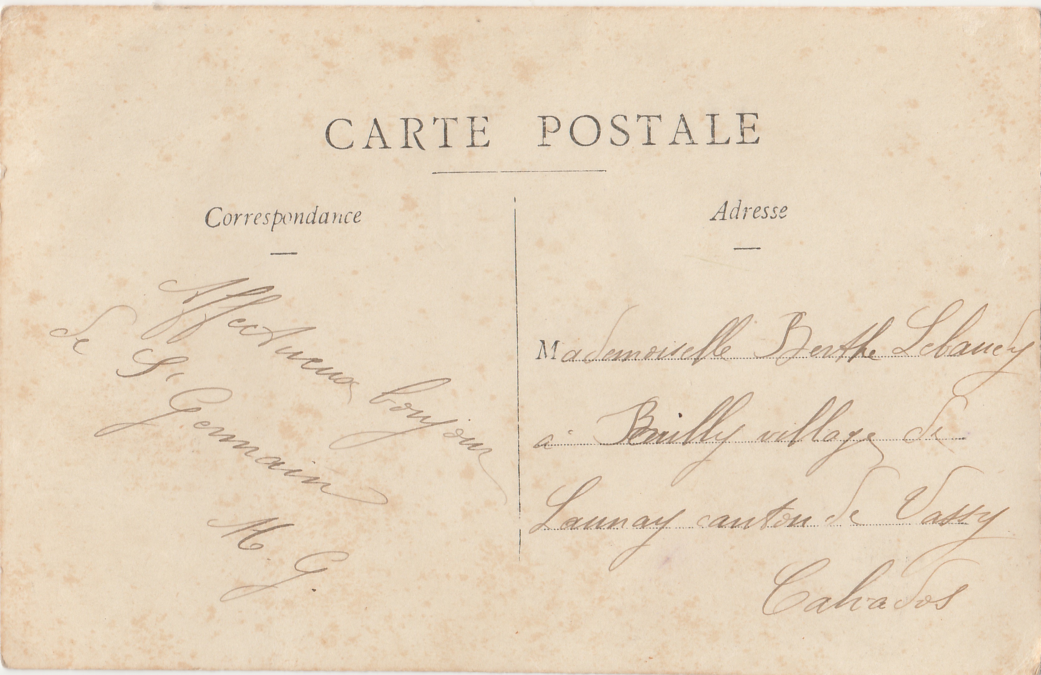 Elle a été écrite par « MG » depuis Saint-Germain. Notre grand-mère avant une cousine dont les initiales concordent : Marie GARNIER est née en 1890 à Saint-Germain-du-Crioult. En 1911, elle est recensée à Saint-Germain chez sa grand-mère Victorine LEBAILLY. Tu nous avait présenté la famille dans ton courrier Jacques GARNIER et Victorine LEBAILLY à Saint-Germain-du-Crioult. J’y avais appris que Marie GARNIER était un « enfant naturel ».