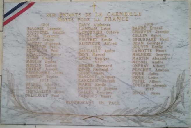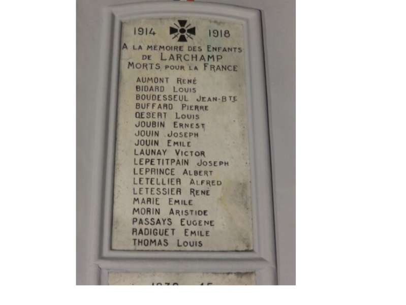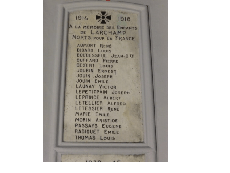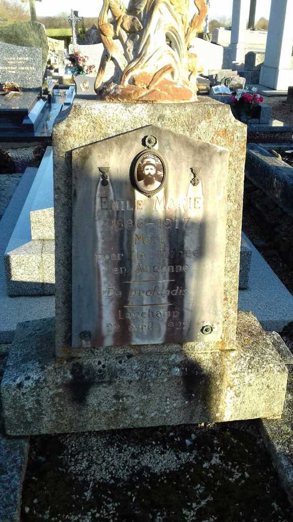 Fait sans doute rare, Émile est mentionné sur les plaques commémoratives de 2 communes: A Larchamp, sur la plaque située sur le mur extérieur de l’église et tenant lieu de monument aux morts; et à la Carneille, sur la plaque située à l’intérieur de l’église. Il faudra vérifier si son nom est inscrit sur le monument aux morts situé dans le cimetière de la Carneille.