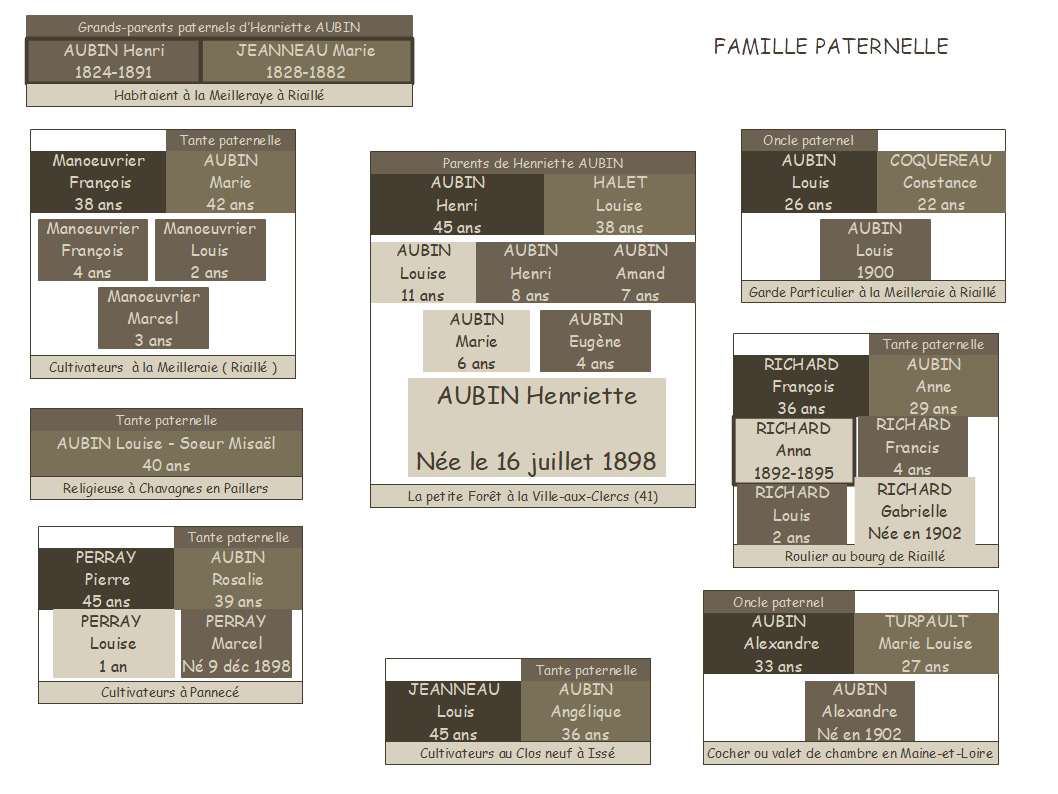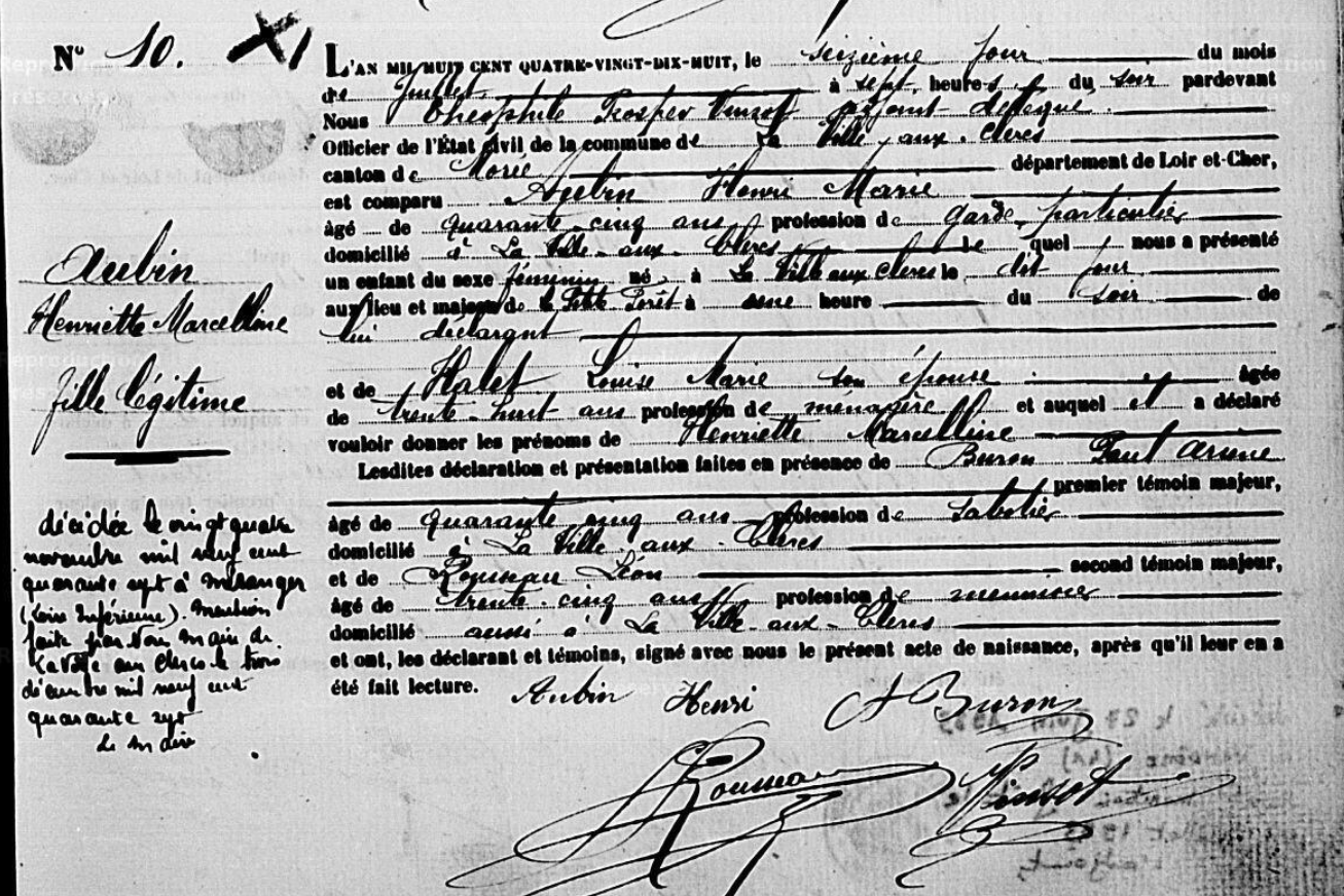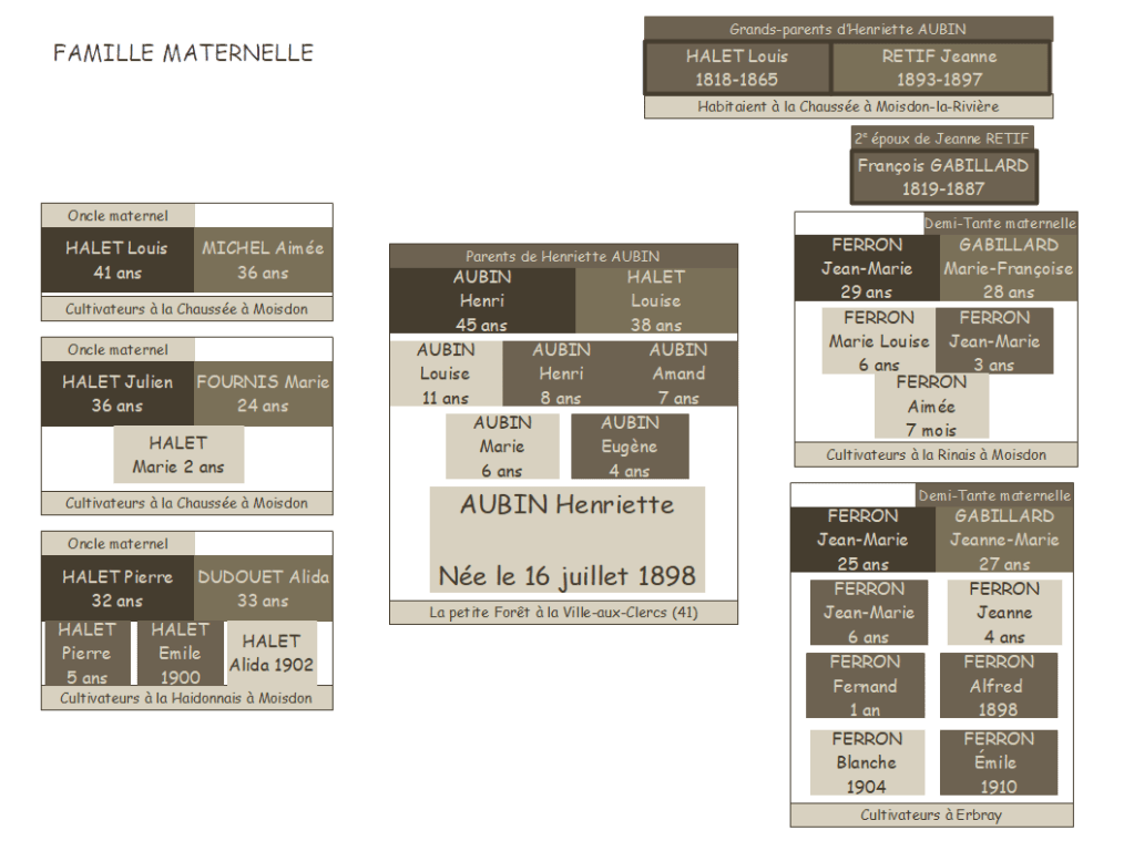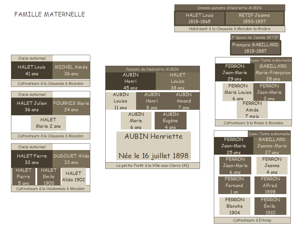 Henriette AUBIN, notre grand-mère, est née le 16 juillet 1898 à la Petite Forêt, lieu-dit de la commune de la Ville-aux-Clercs située dans le Loir-et-Cher, à 17 kilomètres au nord de Vendôme. Elle est née à « une heure du soir » et a été déclarée à la mairie par son père Henri, à sept heures, le soir même.