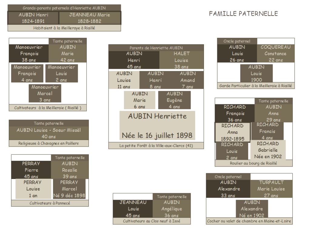 Ses grands-parents, Henri AUBIN et Marie JEANNEAU, sont décédés quelques années plus tôt : Henri à 67 ans en 1891, Marie à 54 ans en 1882. Ils étaient agriculteurs au hameau de la Meilleraye à Riaillé.