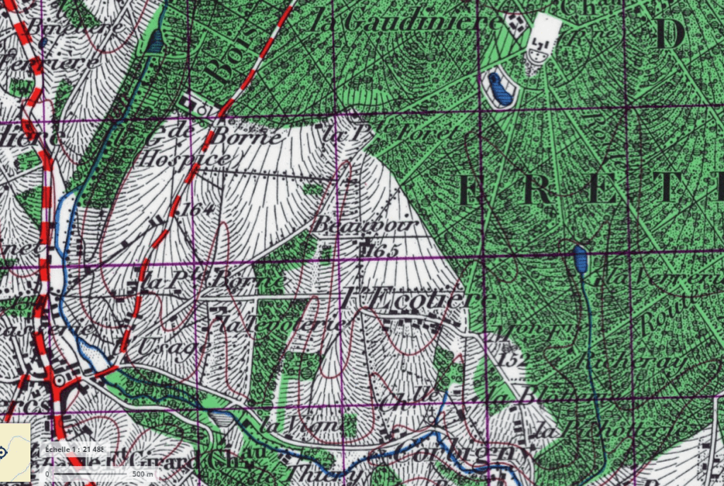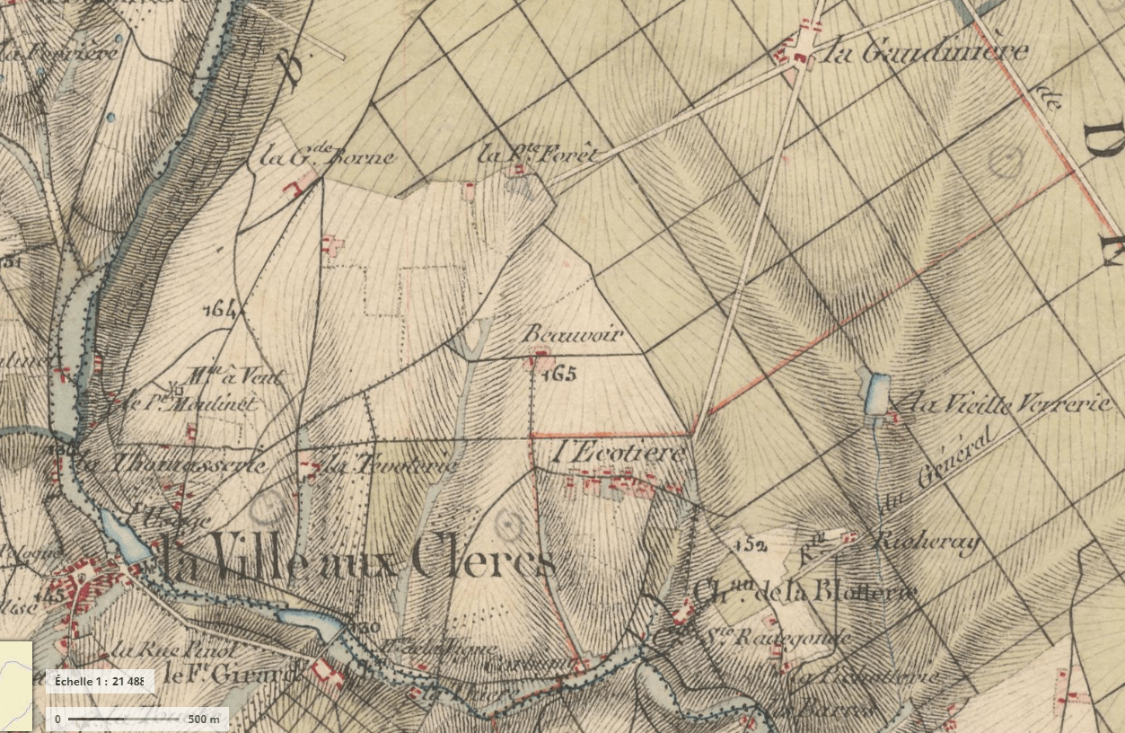 Voici deux cartes anciennes mentionnant la Petite Forêt, et une photo aérienne récente. Le hameau se situe sur le chemin de la Ville-aux-Clercs au château de la Gaudinière :