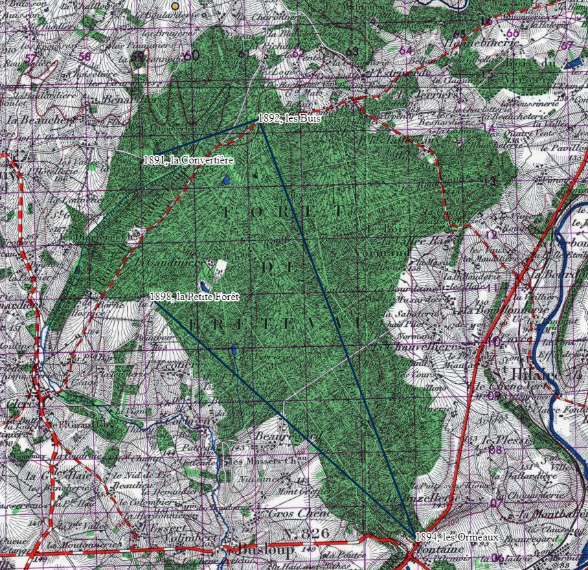 En regardant de plus près, on se rend compte que les quatre communes (la Ville-aux-clercs, Chauvigny-du-Perche, Fontaine-Raoul et Fréteval) sont voisines. Et en repérant sur une carte les hameaux dans lesquels ont eu lieu les naissances, et donc où habitait la famille, on voit que ces hameaux sont tous limitrophes de la forêt de Fréteval, domaine du château de la Gaudinière. Sur la carte ci-dessous, tu peux voir en vert la forêt de Fréteval et les quatre hameaux que j’ai ajoutés :