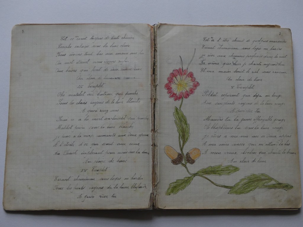 Je poursuis aujourd’hui avec la première chanson du cahier qu’il a réalisé lors de son service militaire : Au clair de la lune. Il ne s’agit pas de la chanson enfantine que nous connaissons. Ici, il n’est question ni de plume, ni d’ami Perrot :