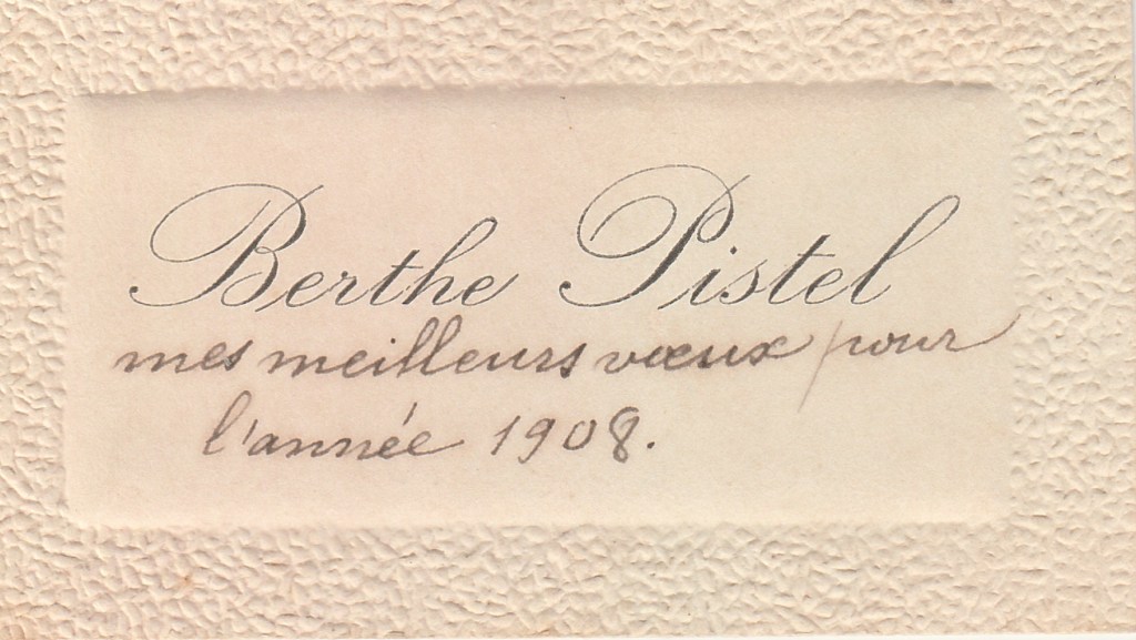 Post Scriptum 1 : Lors de mes premières recherches sur Berthe PISTEL, je n’ai trouvé aucune information à son sujet. Ma première version de ce courrier s’arrêtait donc à « Qui est Berthe PISTEL et d’où a-t-elle postée cette carte ? », en te suggérant de faire ces recherches. Lors d’une dernière relecture, j’ai repris ces recherches et ayant trouvé premières informations, j’ai complété mon courrier du résultat de ces recherches.