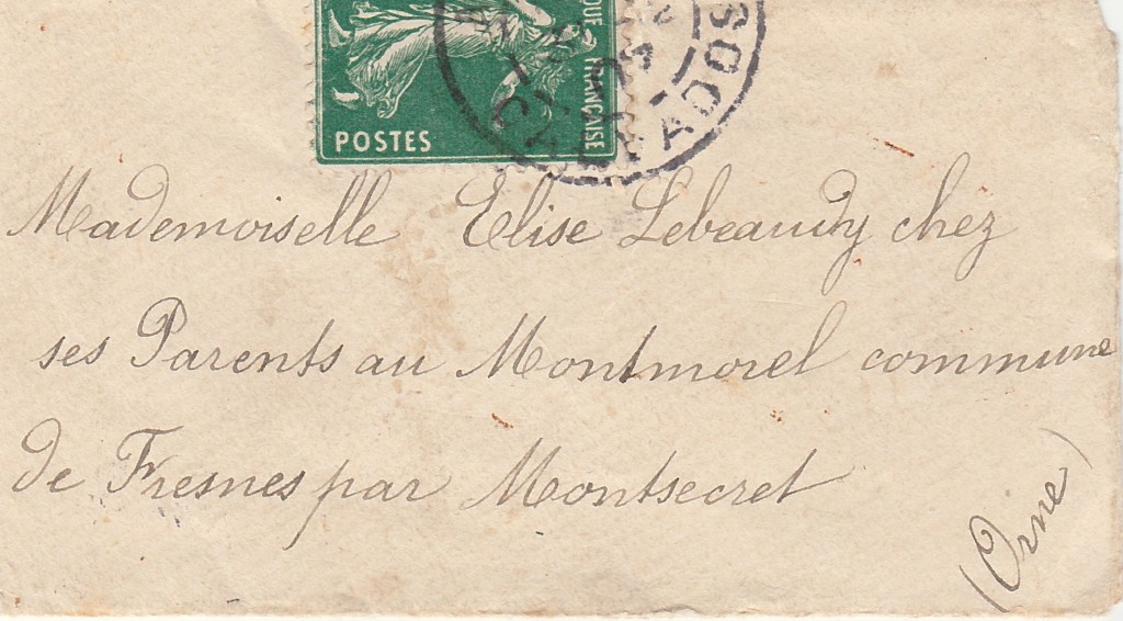 Le cachet de la poste au recto de l’enveloppe, nous indique que la carte a été postée du Calvados. On peut deviner que la commune où a été postée la carte commence par A. Le cachet au recto a été apposé à la réception de la lettre à la poste de Montsecret, avant sa distribution par le facteur.