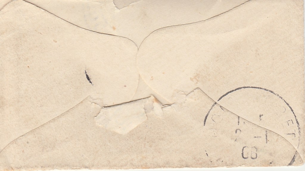 Sainte-Marie-aux-Anglais étant proche de Mézidon, c’est sans doute le cachet de la poste de Mézidon qui a été apposé sur la carte. En regardant plus attentivement l’enveloppe, il est probable que ce que je croyais être un A est en fait la première partie d’un M.