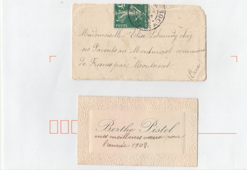 Je t’ai présenté les sœurs de notre grand-mère dans une précédente lettre : Elise et Alice LEBAUDY. Les deux sœurs étant décédées très jeunes, Elise à 16 ans, et Alice à 7 ans, notre grand-mère a conservé quelques documents en leur souvenir. En voici l’un d’eux. Il s’agit d’une petite carte de vœux, dans sa petite enveloppe.