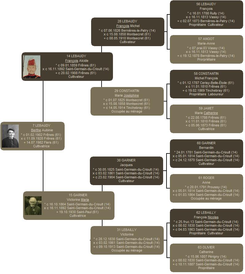 Tu m’avais appris, dans une de tes premières lettres (La branche LEBAUDY) que les grands-parents paternels de notre grand-mère Berthe LEBAUDY s’appellent François LEBAUDY et Joséphine CONSTANTIN. On les trouvent dans l’arbre généalogique ci-dessous, portant les numéros 28 et 29 :