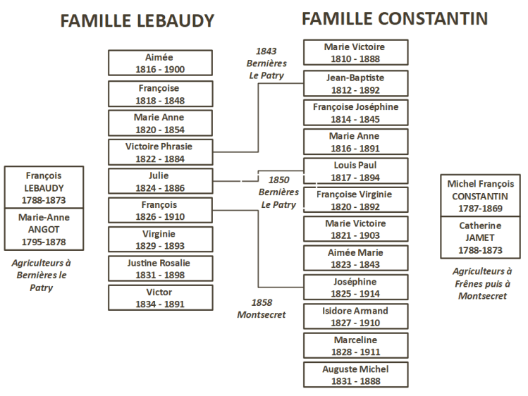Au milieu, j’ai indiqué les années et lieux de mariage des couples LEBAUDY-CONSTANTIN.