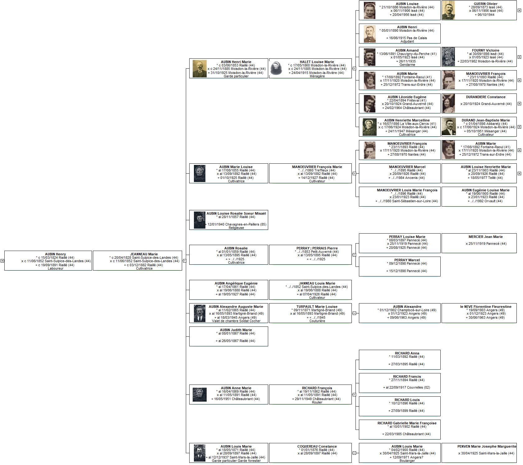 - Alexandre (Riaillé 1865 – Angers 1945). Il est valet de chambre, mais aussi cocher. Il vit à Angers. Son épouse, Marie Louise TURPAULT, est couturière. Ils ont au moins un enfant, Alexandre, né en 1902.