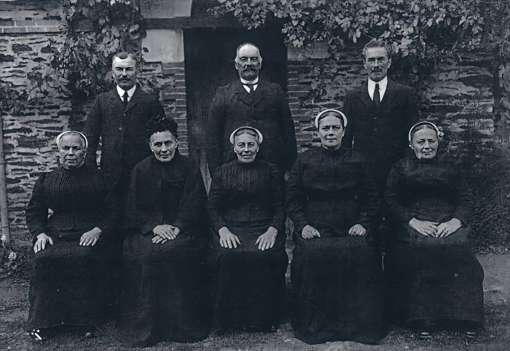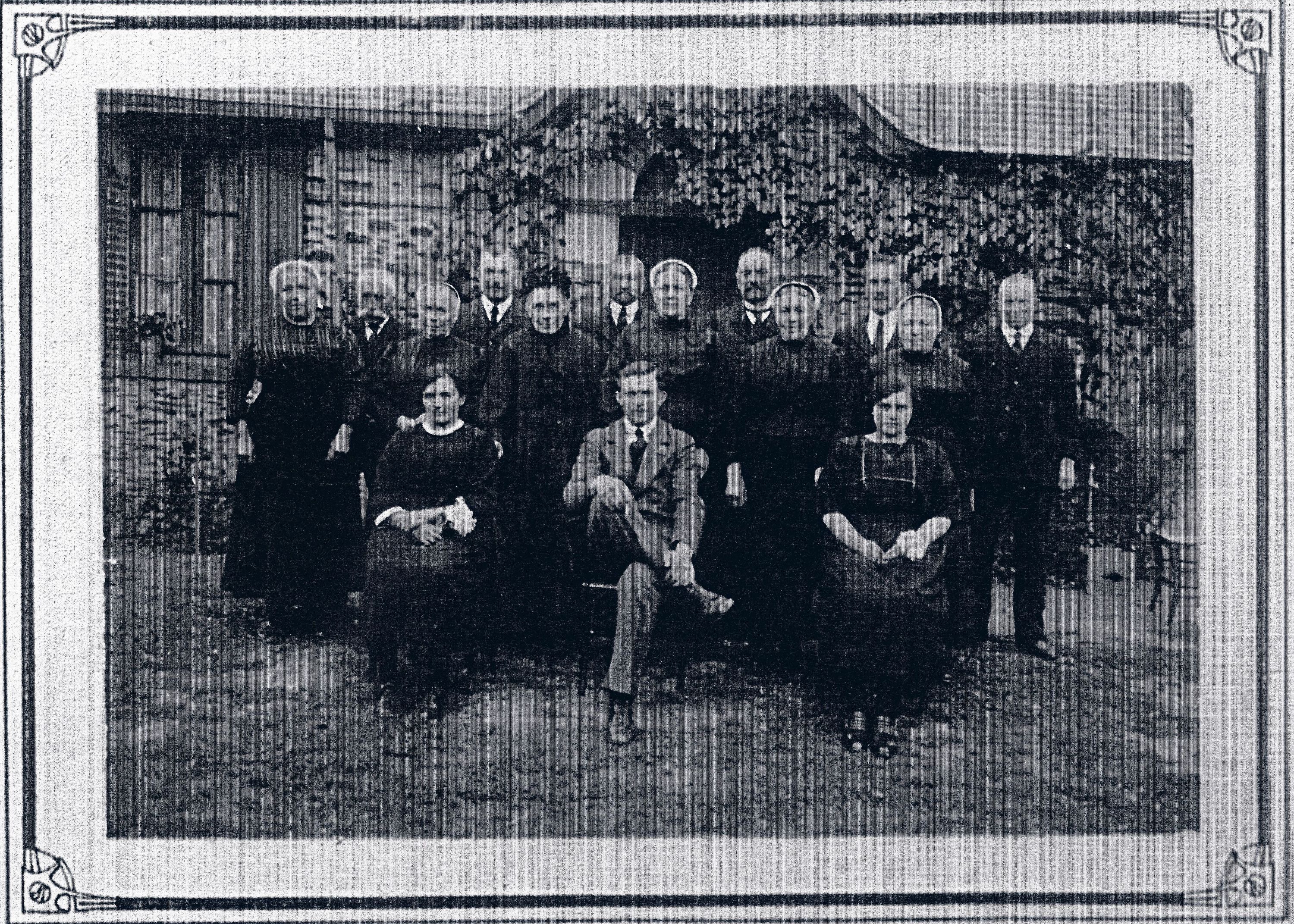 Je ne connais pas la date de la photo. Il existe une autre photo qui semble avoir été prise le même jour où on voit les mêmes personnes que sur la première photo, auxquels sont venus se joindre les conjoints et enfants. Je n’y reconnais pas notre arrière-grand-mère Louise HALET qui est décédée en 1915. Notre arrière-grand-père et une de ses sœurs étant décédée en 1925, la photo a été prise aux environs de 1920. Je ne sais pas à quelle occasion toute la famille s’était ainsi réunie.