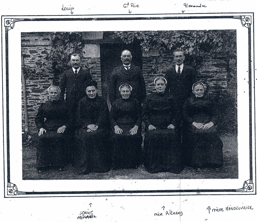 - Tout à droite est assise Marie (Riaillé 1855 – Riaillé 1925), l’ainée des sœurs, mariée à François MANOEUVRIER. Ils sont cultivateurs à la Meilleraie à Riaillé et ont trois fils : François né en 1893, Marcel né en 1895 et Louis en 1896. François (le fils) se mariera avec sa cousine Marie AUBIN, la sœur de notre grand-mère Henriette.