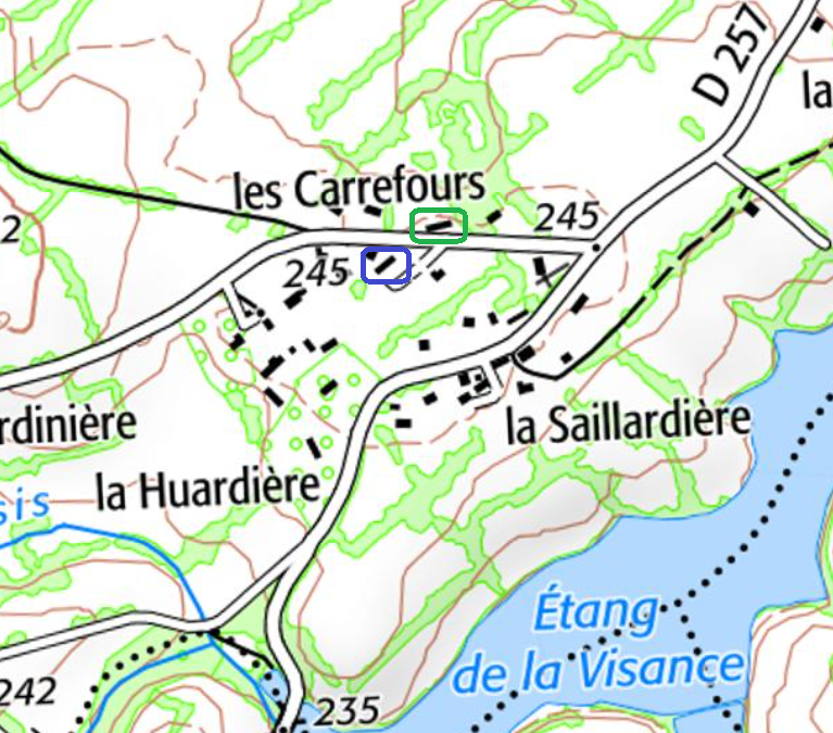 Le hameau des Carrefours se situe sur la commune de Landisacq à environ 1500 mètres du bourg. Comme tu peux le voir sur cette carte IGN contemporaine, il est tout proche des hameaux de la Huardière (où est né notre grand-père Henri MARIE – voir La naissance d’Henri MARIE), et de la Saillardière. Le barrage de la Visance a été créé en 1952, l’étang n’existait pas auparavant.