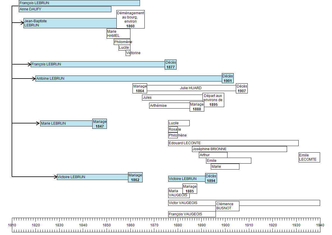 Voici une frise chronologique indiquant les personnes de notre famille ayant habité aux Carrefours depuis le premier recensement disponible (1846), jusqu’à la veille de la seconde guerre mondiale (recensement de 1936). Les barres représentent leurs périodes de présence aux Carrefours. Les barres bleus correspondent aux membres de la première famille occupante connue.