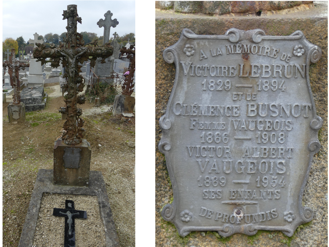Grâce à l’entretien fait par notre oncle André, tu peux toujours voir la tombe de notre arrière-arrière-grand-mère Victoire LEBRUN au cimetière de Landisacq. Y sont aussi inhumés son fils Victor VAUGEOIS avec sa femme Clémence BUSNOT.