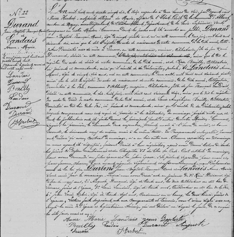 Jean-Baptiste se marie le 16 novembre 1890 en Abbaretz, avec sa cousine Anne-Marie LANDAIS qui habite à la Foie. Les deux villages sont assez proches, ils se sont probablement régulièrement vus dés leur enfance. Ses deux frères René et Auguste sont témoins :