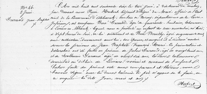Jean-Baptiste est né le 2 juin 1866 à « 7 heures du soir » à Limaro en Abbaretz. Son père, René DURAND, 46 ans, est laboureur. Sa mère, Rose BOUILLY, cultivatrice, a 41 ans. Son père le déclare à la mairie le lendemain matin, avec comme témoins, Julien DURAND, 28 ans, et Mathurin DURAND, 26 ans, tous les deux laboureurs, voisins à Limaro, et fils de Julien DURAND, cousin de René DURAND :