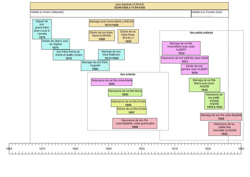 Voici une chronologique (réalisée avec frisechronos.fr) mentionnant les principaux évènements. Dans le haut, j’ai indiqué ses lieux de résidence. Dans les rectangles bleus, figurent les évènements liés à ses frères. J’ai ensuite choisi une couleur pour chacun de ses enfants, en conservant la même couleur pour les petits-enfants :