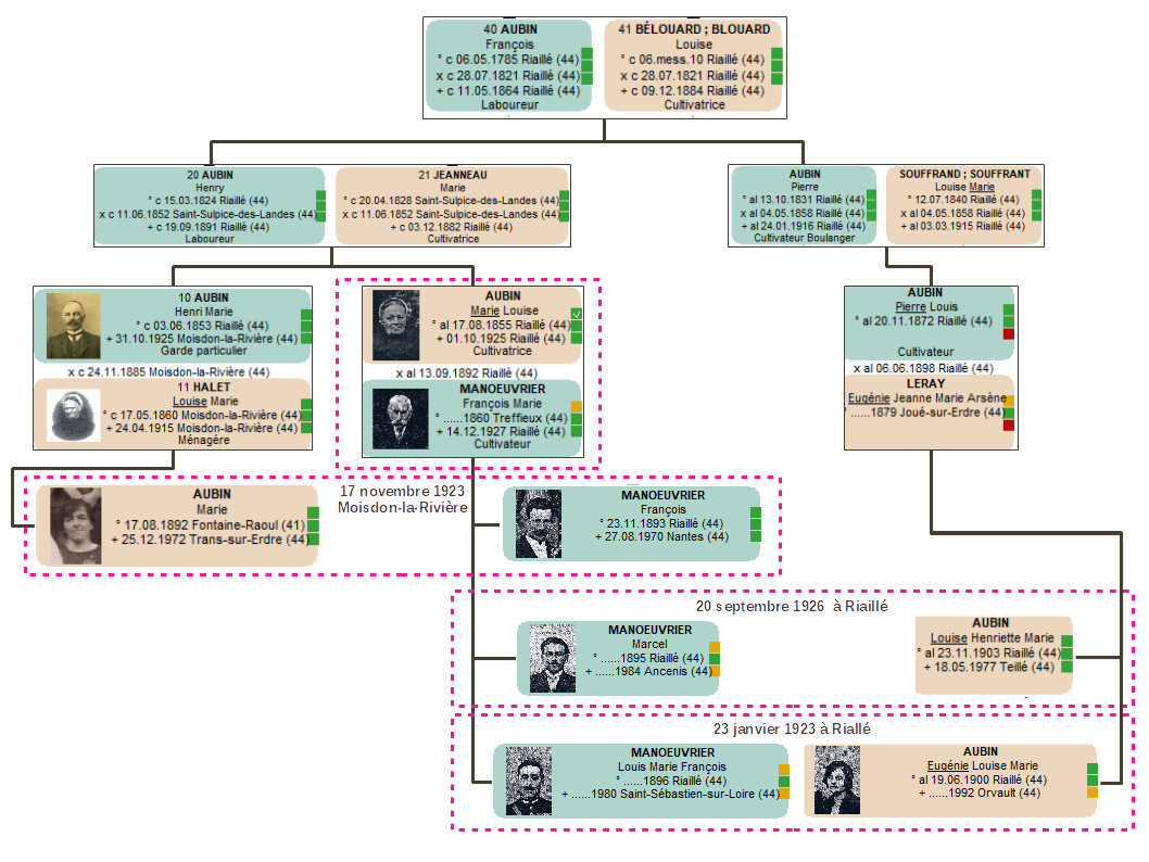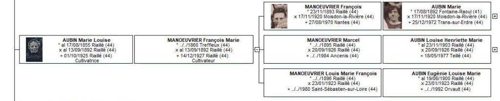 La tante et l’oncle de nos parents, Marie AUBIN et François MANOEUVRIER, qui se sont mariés en 1923, sont cousins : La mère de François MANOEUVRIER, Marie AUBIN était une sœur de notre arrière-grand-père Henri AUBIN, mariée à François MANOEUVRIER père en 1892. Donc François MANOEUVRIER, fils de François MANOEUVRIER et Marie AUBIN, a épousé Marie AUBIN, nièce de Marie AUBIN ! Il faut bien suivre pour ne pas perdre le fil !