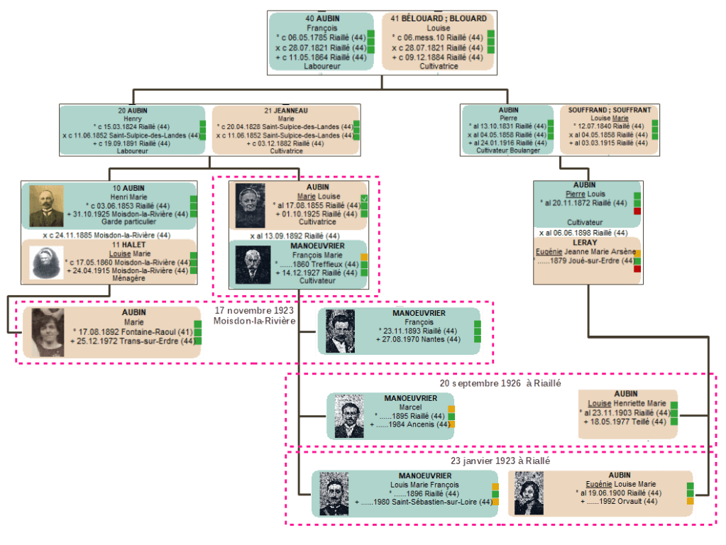 Mais qui sont Louise AUBIN et Eugénie AUBIN, mariées aux deux frères de François MANOEUVRIER ? Quels sont les liens de parentés entre toutes ces personnes? C’est ce que j’ai voulu savoir. J’ai illustré le résultat de mes recherches dans l’arbre généalogique ci-dessous, sur lequel j’ai entouré les mariages MANOEUVRIER-AUBIN d’un joli pointillé rose :