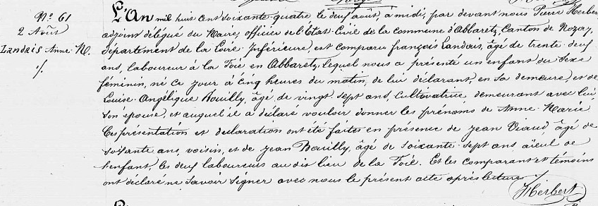 Anne-Marie est née le 2 août 1864 à cinq heures du matin, à la Foie en Abbaretz. Sa mère, Louise BOUILLY, 27 ans, qui porte en second le joli prénom d’Angélique est cultivatrice. Son père, François LANDAIS, qui est âgé de 32 ans et laboureur, déclare sa naissance à midi, avec comme témoins, Jean VIAUD et Jean BOUILLY son grand-père, tous deux laboureurs à la Foie.