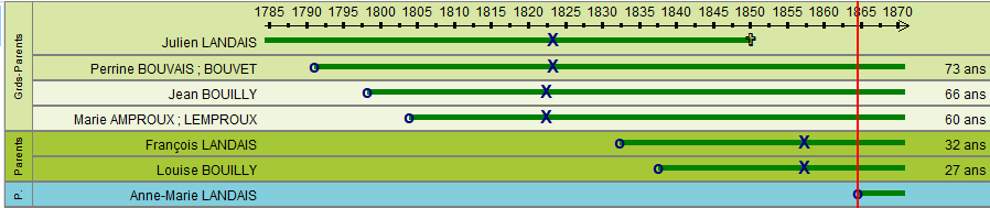 Son grand-père paternel, Julien LANDAIS, est décédé en 1850. C’est le frère de Michel LANDAIS, grenadier à cheval de la garde impériale, qui avait été fait Chevalier de la Légion d’Honneur, en 1815 pendant les 100 jours (voir Les grognards de la famille). Ce grand-oncle d’Anne-Marie est décédé en 1852, soit douze ans avant sa naissance. Je ne sais pas si son histoire lui a été racontée.