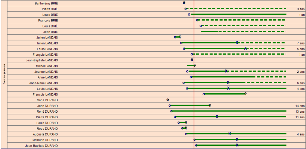 Je lui ai trouvé 26 cousins dont son futur époux Jean-Baptiste DURAND, notre arrière-grand-père. Treize sont vivants et âgés de 1 à 14 ans au moment de sa naissance, sept sont décédés en bas-âge, et six naitront après elle :