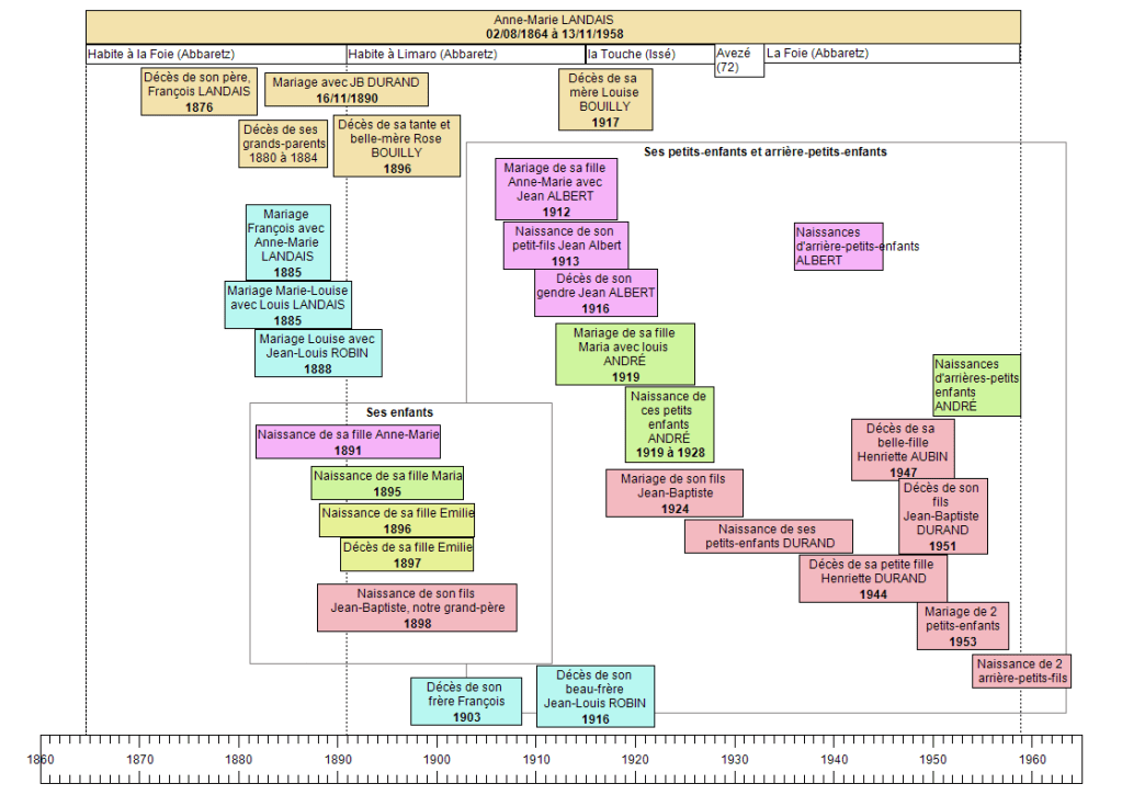 Voici une chronologique (réalisée avec frisechronos.fr) mentionnant les principaux évènements de sa vie. Dans le haut, j’ai indiqué ses lieux de résidence. Dans les rectangles bleus, figurent les évènements liés à ses sœurs et à son frère. J’ai ensuite choisi une couleur pour chacun de ses enfants, en conservant la même couleur pour les petits-enfants :