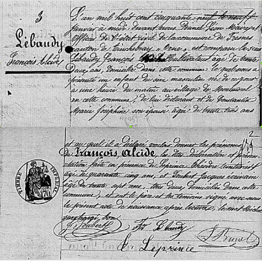 François nait le 9 janvier 1859 à une heure du matin au Mont Morel à Frênes (Orne) où ses parents sont agriculteurs. Son père, qui porte aussi le prénom de François, va le déclarer en mairie à midi, en lui donnant les prénoms François Alcide. Son père a 32 ans, sa mère, Joséphine CONSTANTIN, a 33 ans. C’est le premier enfant de la famille, ses parents s’étant mariés en août 1858 (je te laisse vérifier s’il y a plus de 9 mois entre le mariage et la naissance de François…).