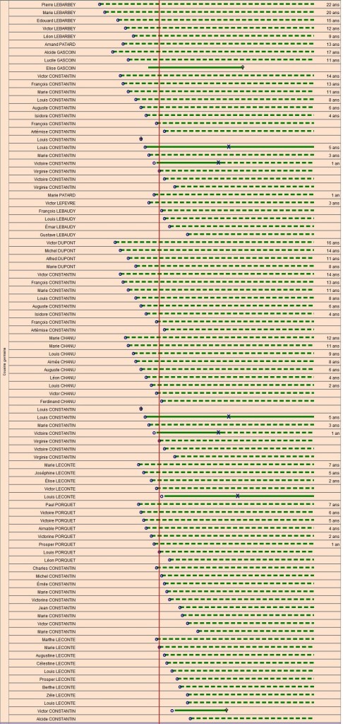 Il a énormément de cousins et cousines. J’en ai trouvé soixante-seize ! En voici la liste avec leur âge à la naissance de François pour ceux qui sont nés avant lui. Il y plus de soixante-seize lignes, certains apparaissant deux fois, puisque deux frères de la mère de François se sont mariés avec deux sœurs de son père. Je t’avais raconté cela dans cette lettre : Quand les familles LEBAUDY et CONSTANTIN s’unissent. Pierre LEBARBEY, l’ainé de ses cousins, est né en 1836 et a donc 21 ans à la naissance de François. Quand la plus jeune, Marie CONSTANTIN, nait en 1874, François a 15 ans :