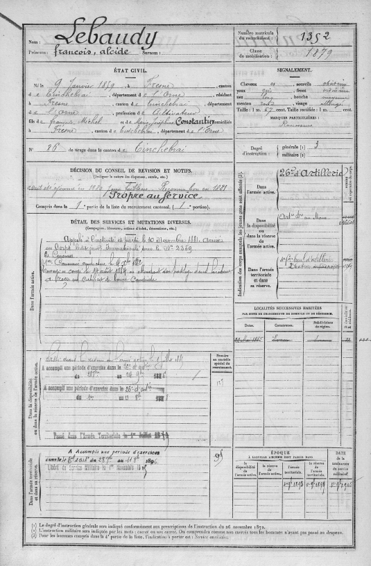 Après avoir été ajourné pour faiblesse en 1880, Il est incorporé le 10 novembre 1881 au 26e régiment d’artillerie comme second canonnier. Il est promu au grade de premier canonnier conducteur le 14 décembre 1882. Après 2 ans et 9 mois de service, il est envoyé en congé le 14 août 1884 avec un certificat de bonne conduite. Il a alors 25 ans.